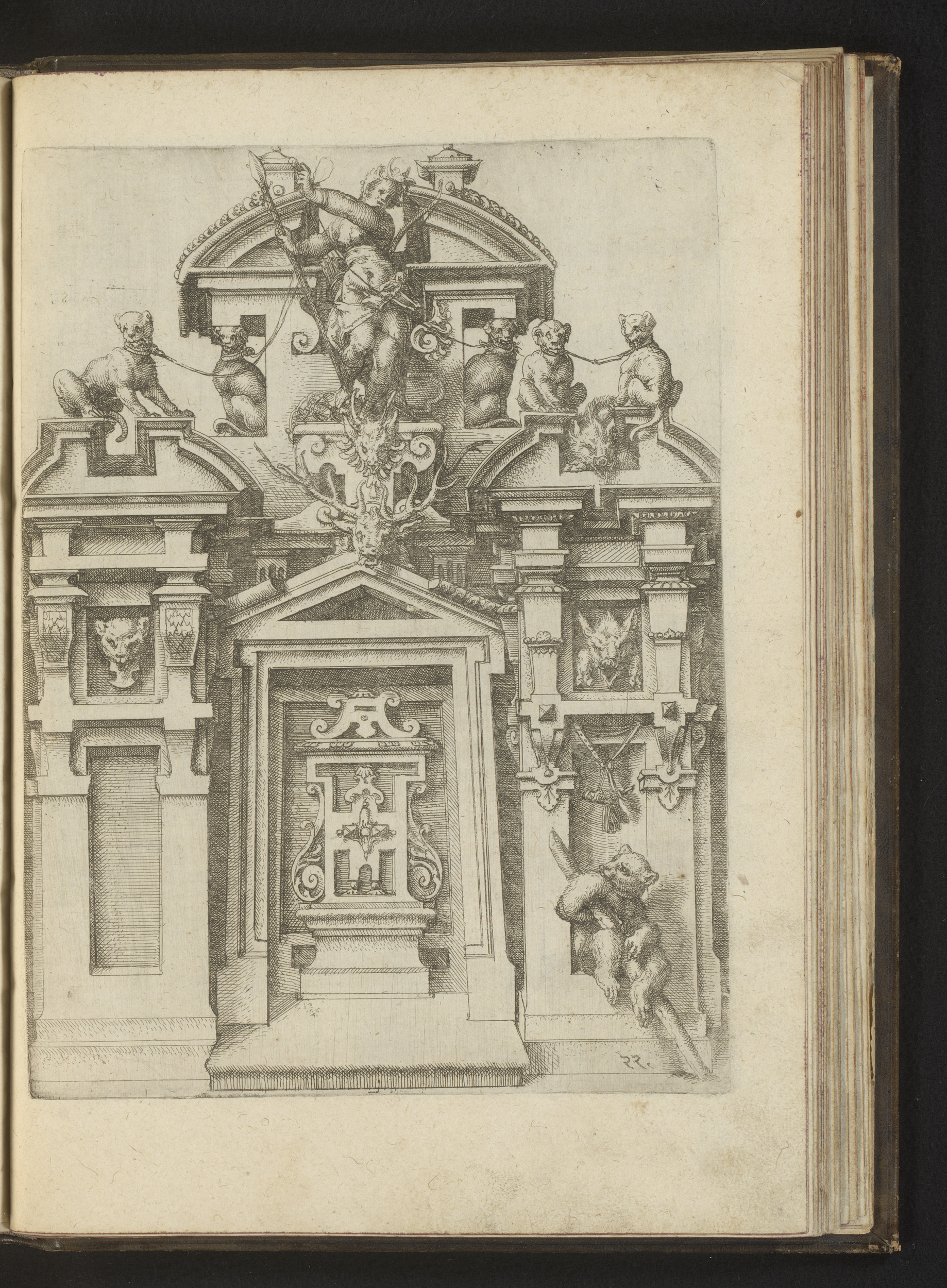 Ruïne van een poort met daarop herten, honden, leeuw...