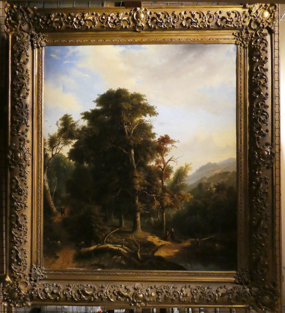 Bosgezicht met figuren op een zandpad
