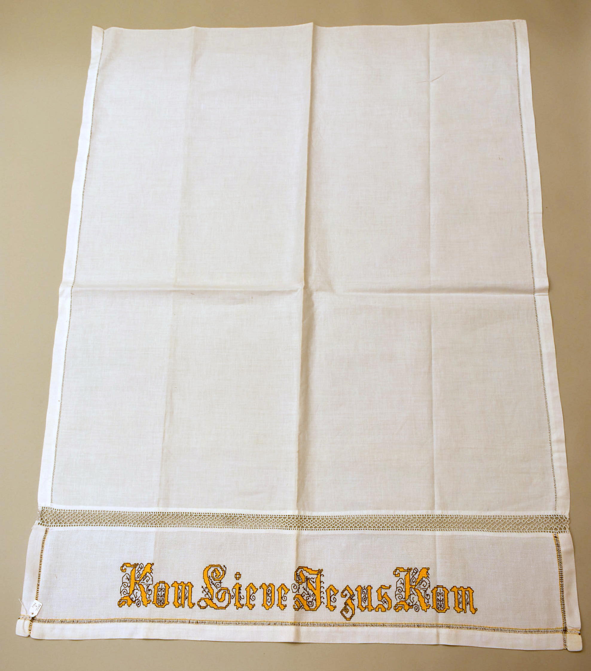Communiedoek, hoort bij StCC v46, geborduurd in geel...