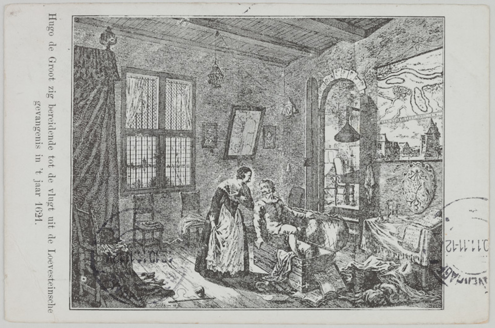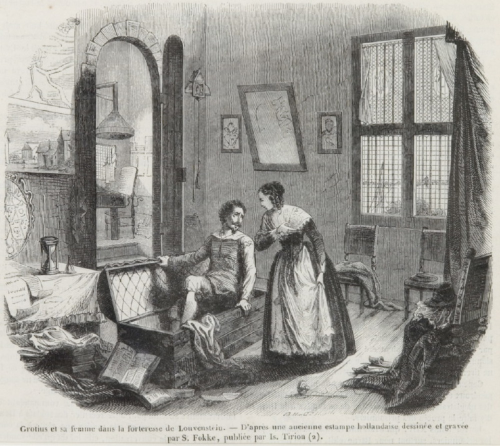 Hugo de Groot verbergt zich in de boekenkist