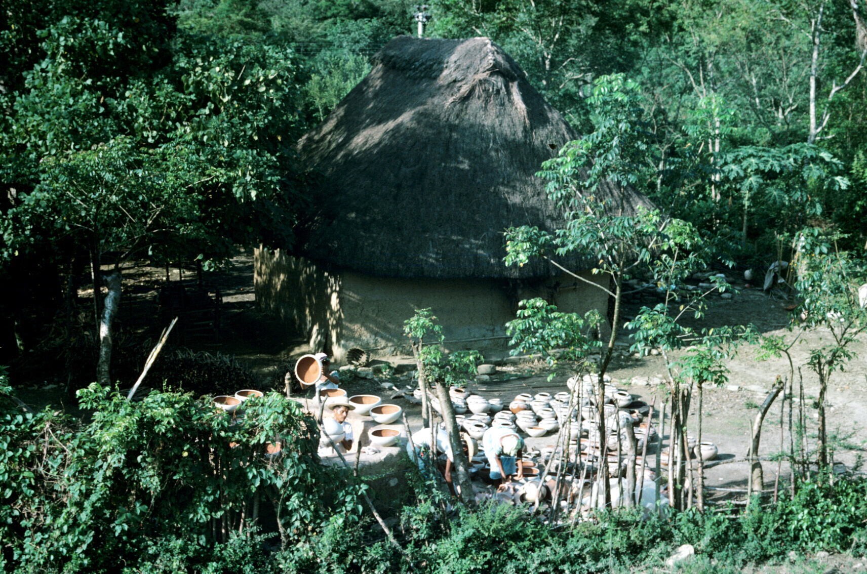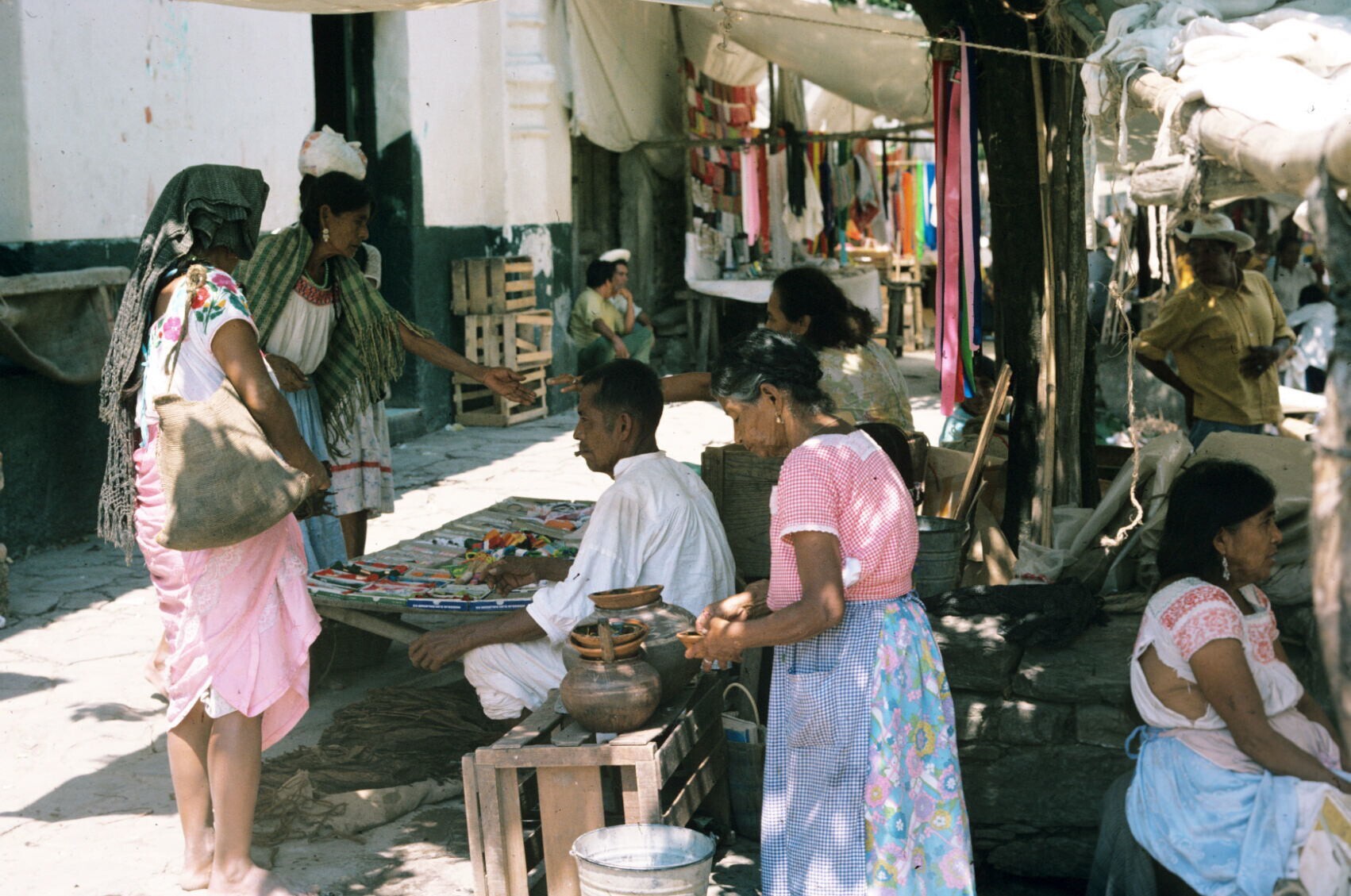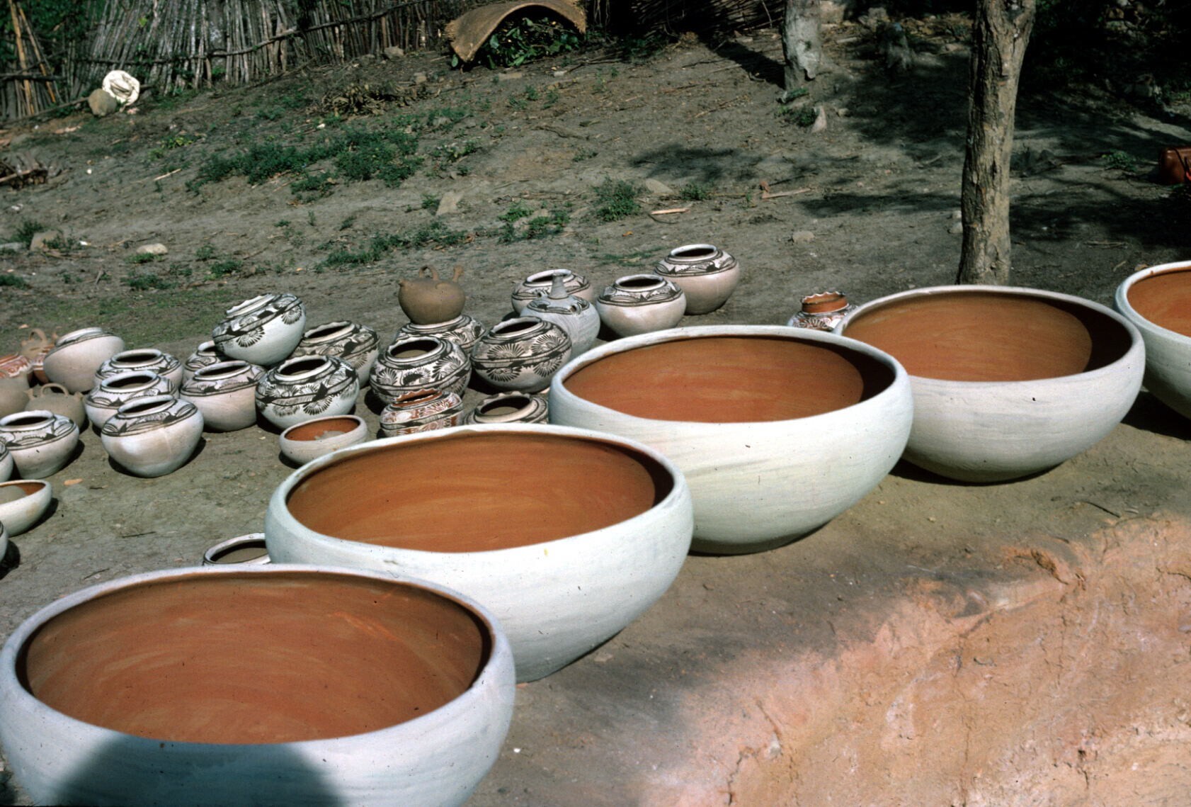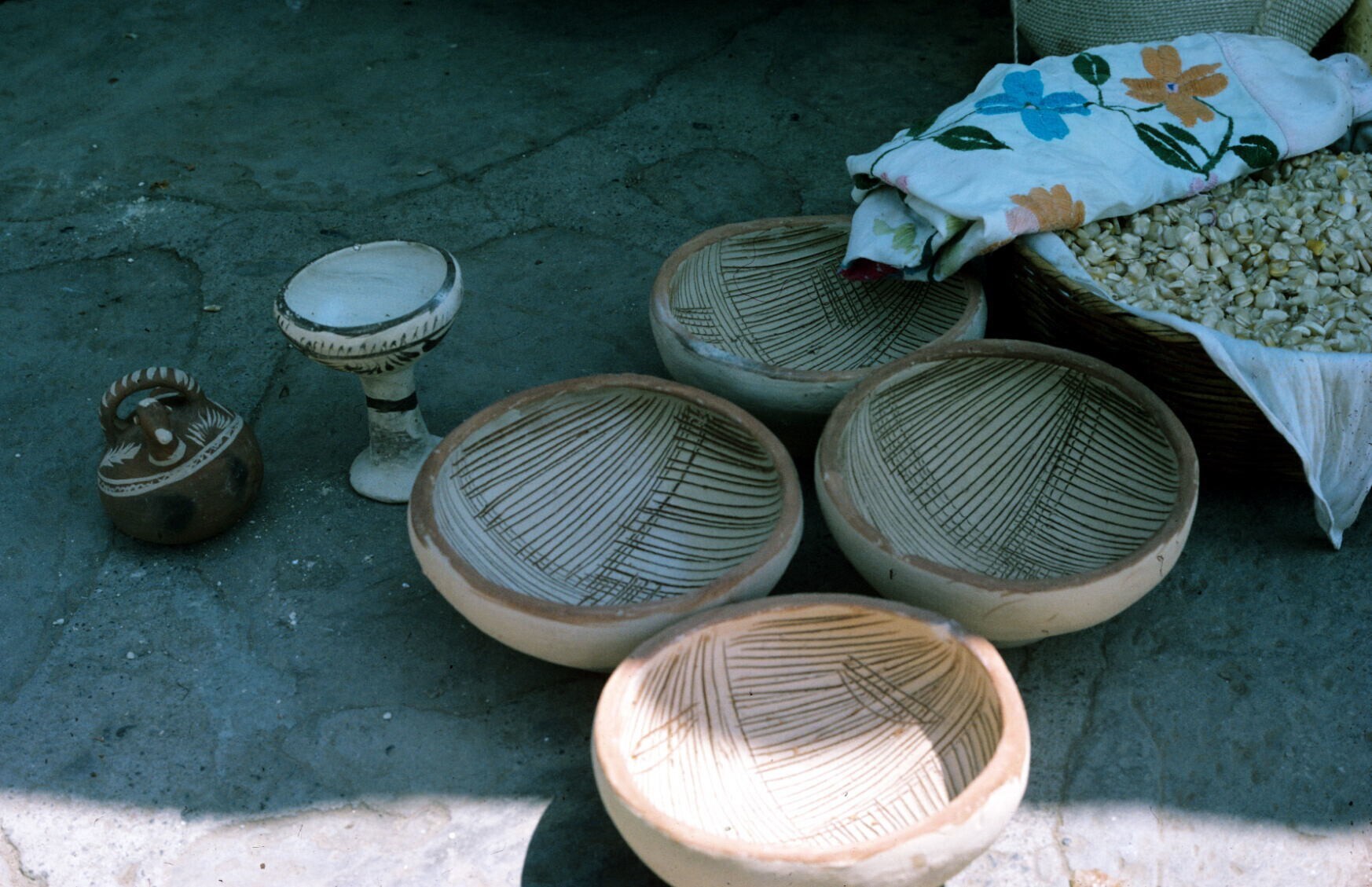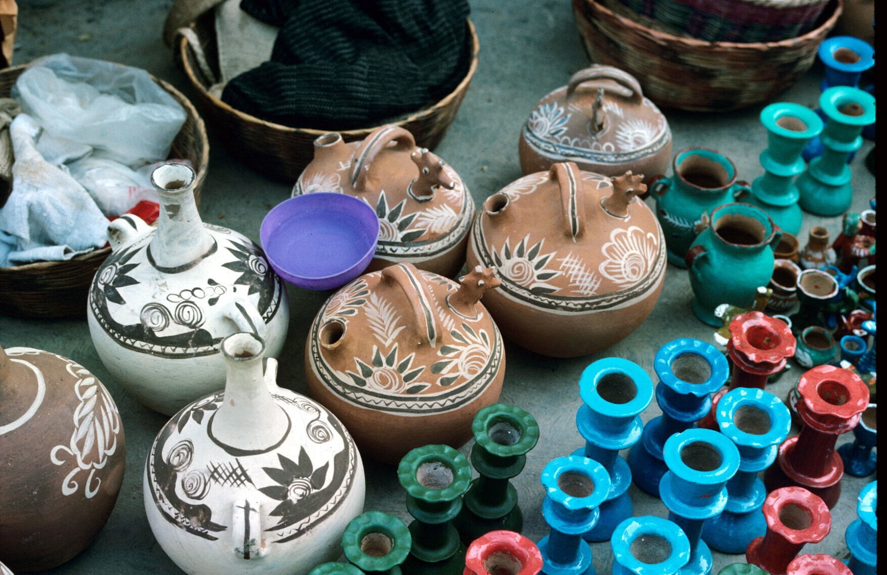 aardewerk, o.a. molcajetes (wrijfschalen), op markt