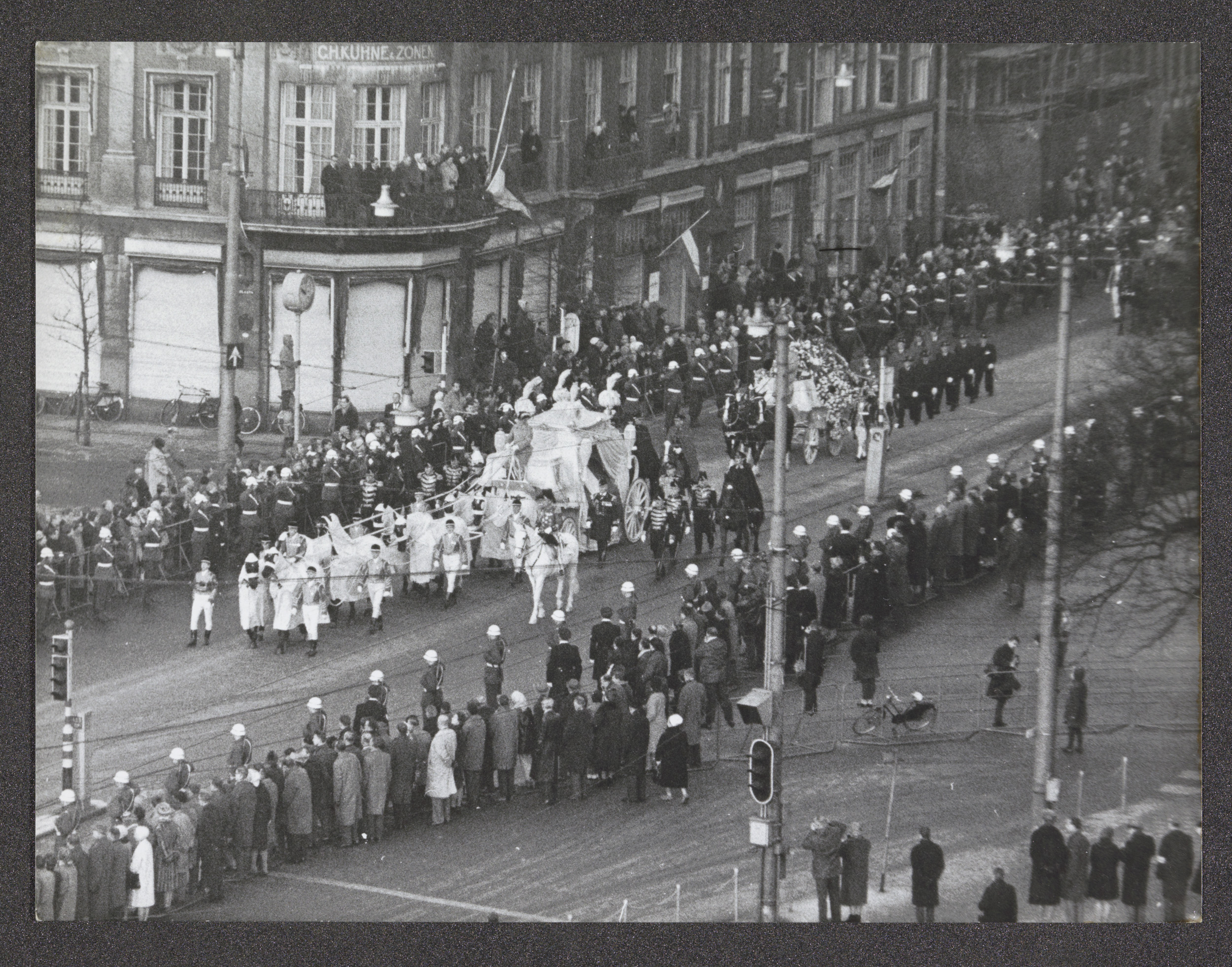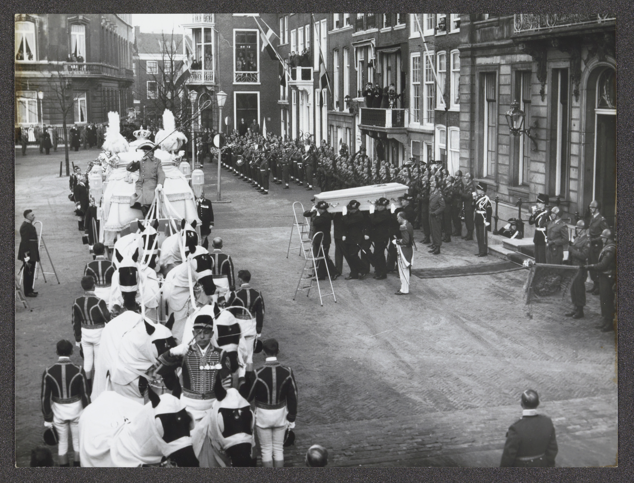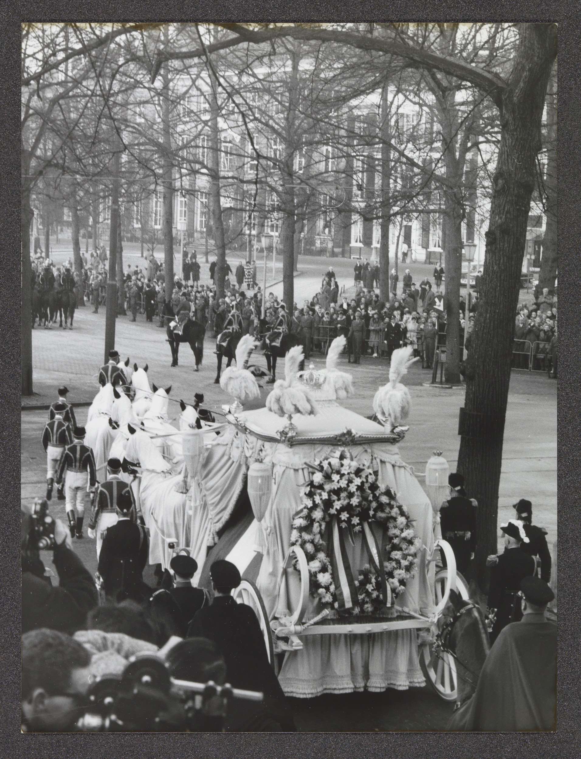 Lijkkoets met de kist met koningin Wilhelmina met ge...