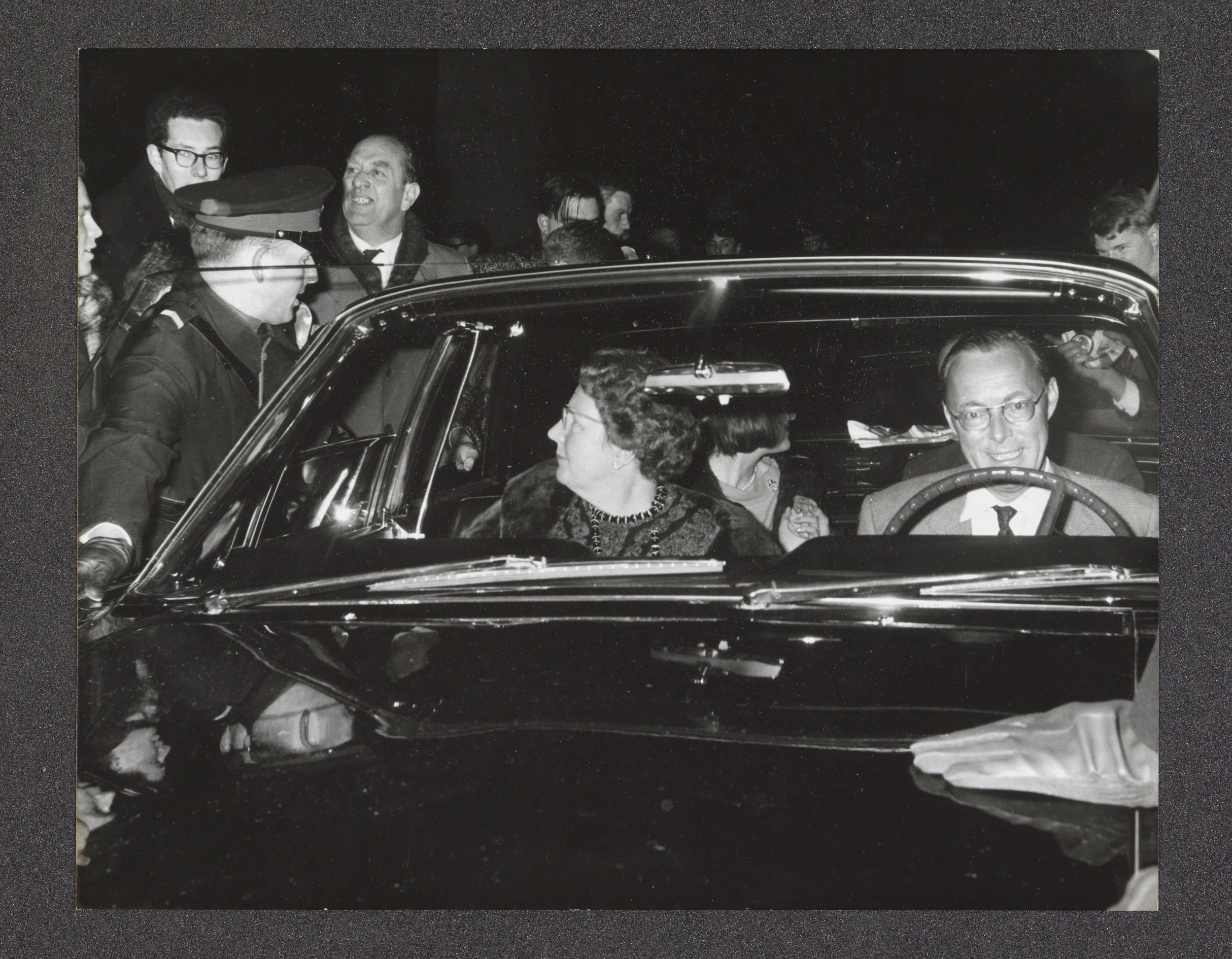 Menigte omringt de auto met daarin prinses Irene en ...