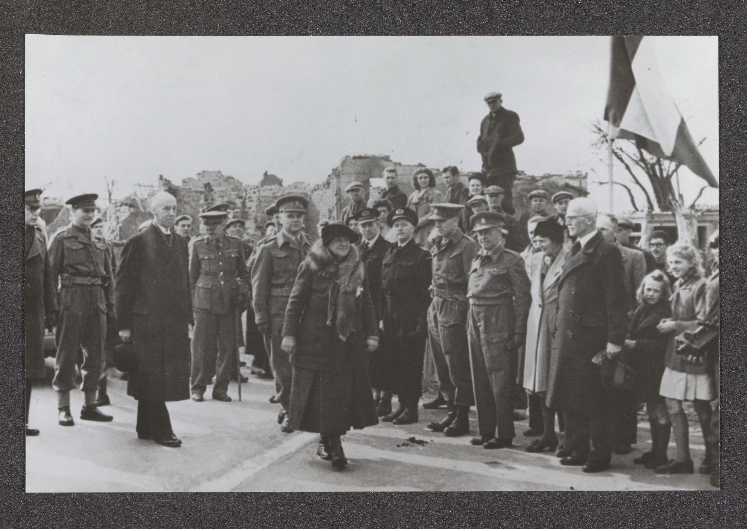 Menigte omringt de auto met daarin koningin Juliana ...