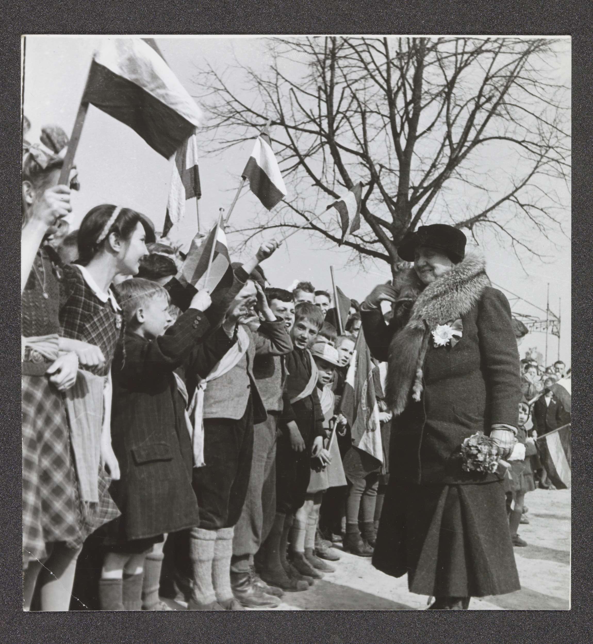 Koningin Wilhelmina loopt langs een haag van kinderen