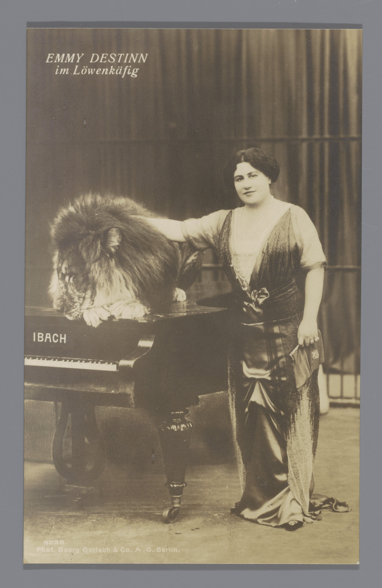 Operazangeres Emmy Destinn aait een leeuw op een piano