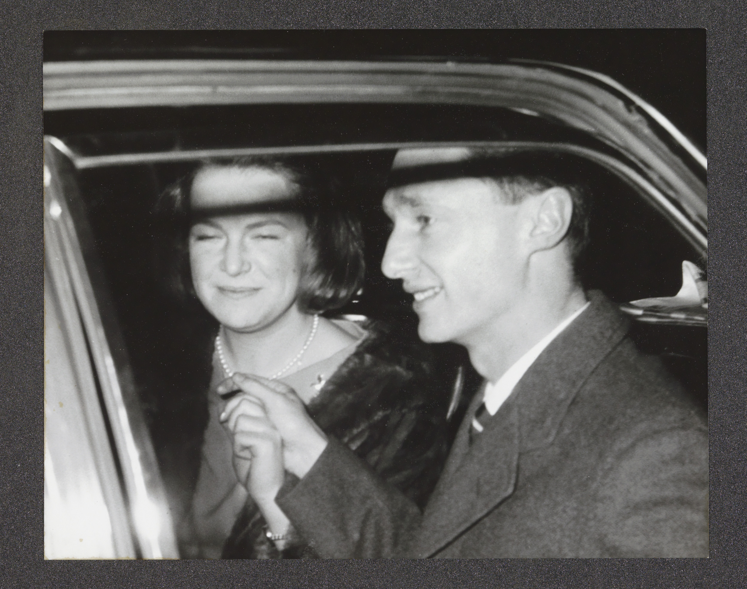 Prinses Irene en prins Carlos achterin een auto