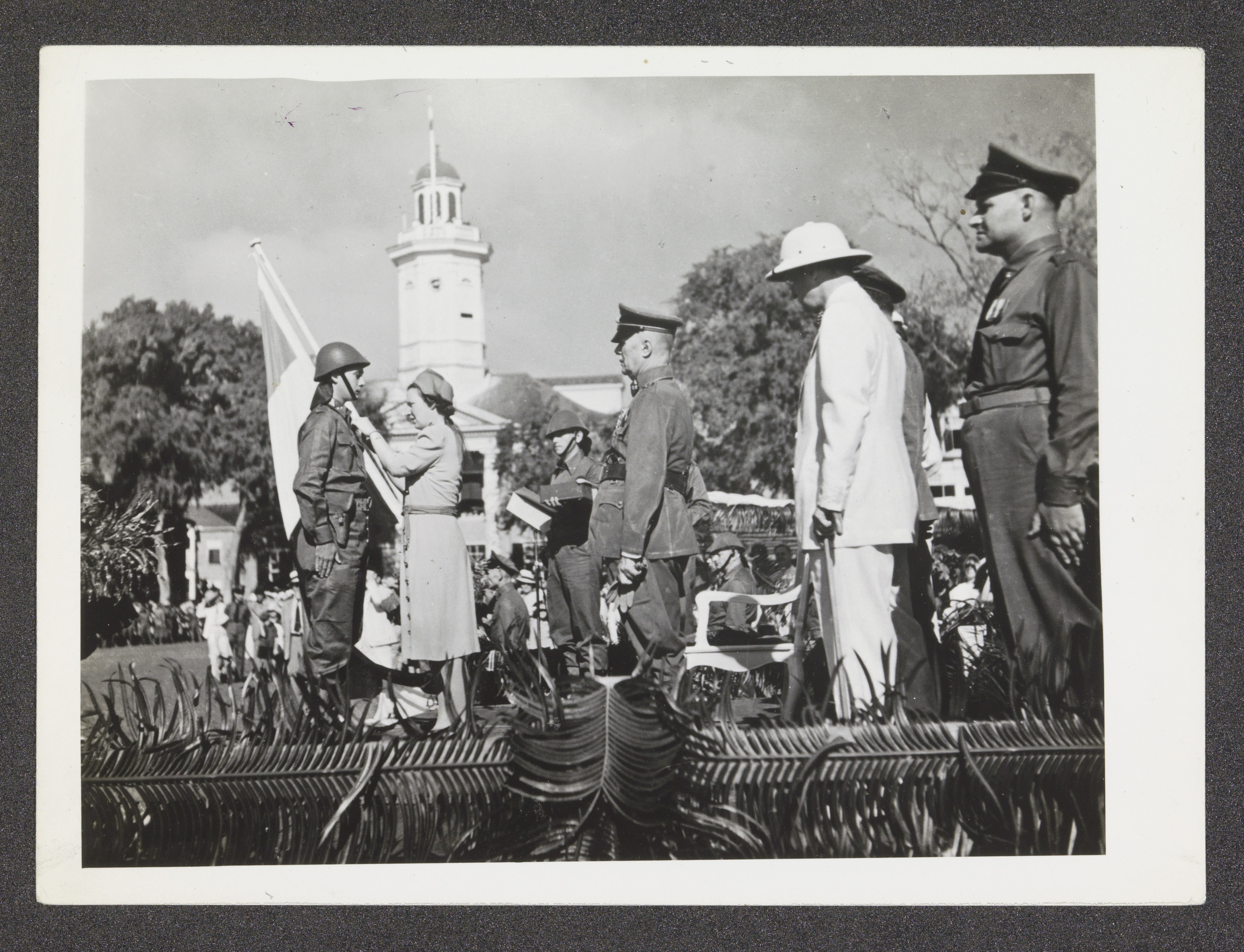 Koningin Wilhelmina loopt langs een haag militairen ...