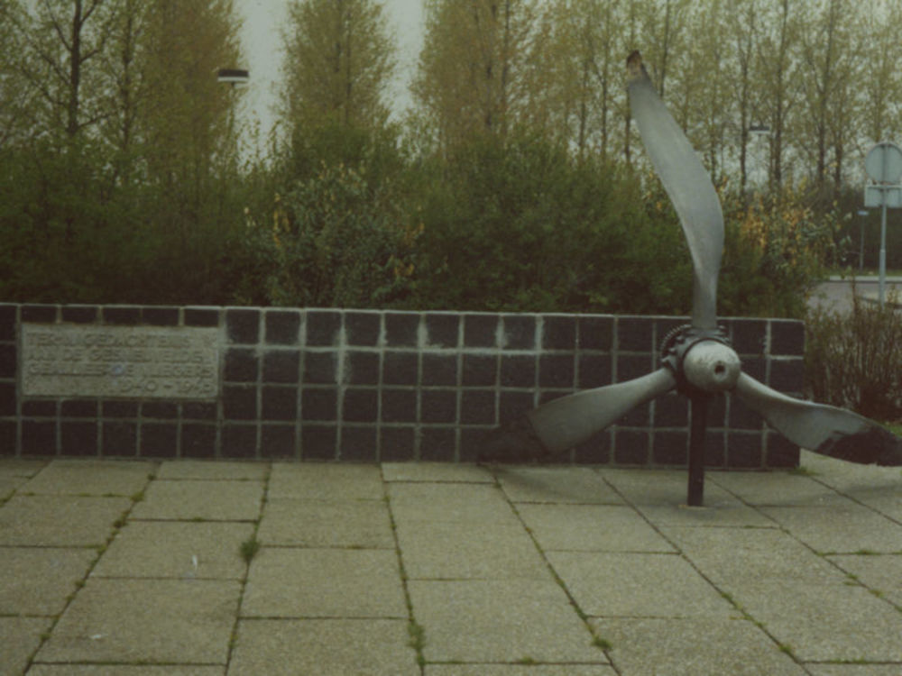 Foto monument met driebladige propeller.Tekst: "Gede...