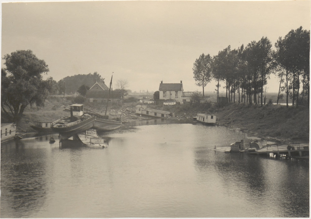 In de Nieuwe Haven liggen vernielde boten. Op de ach...