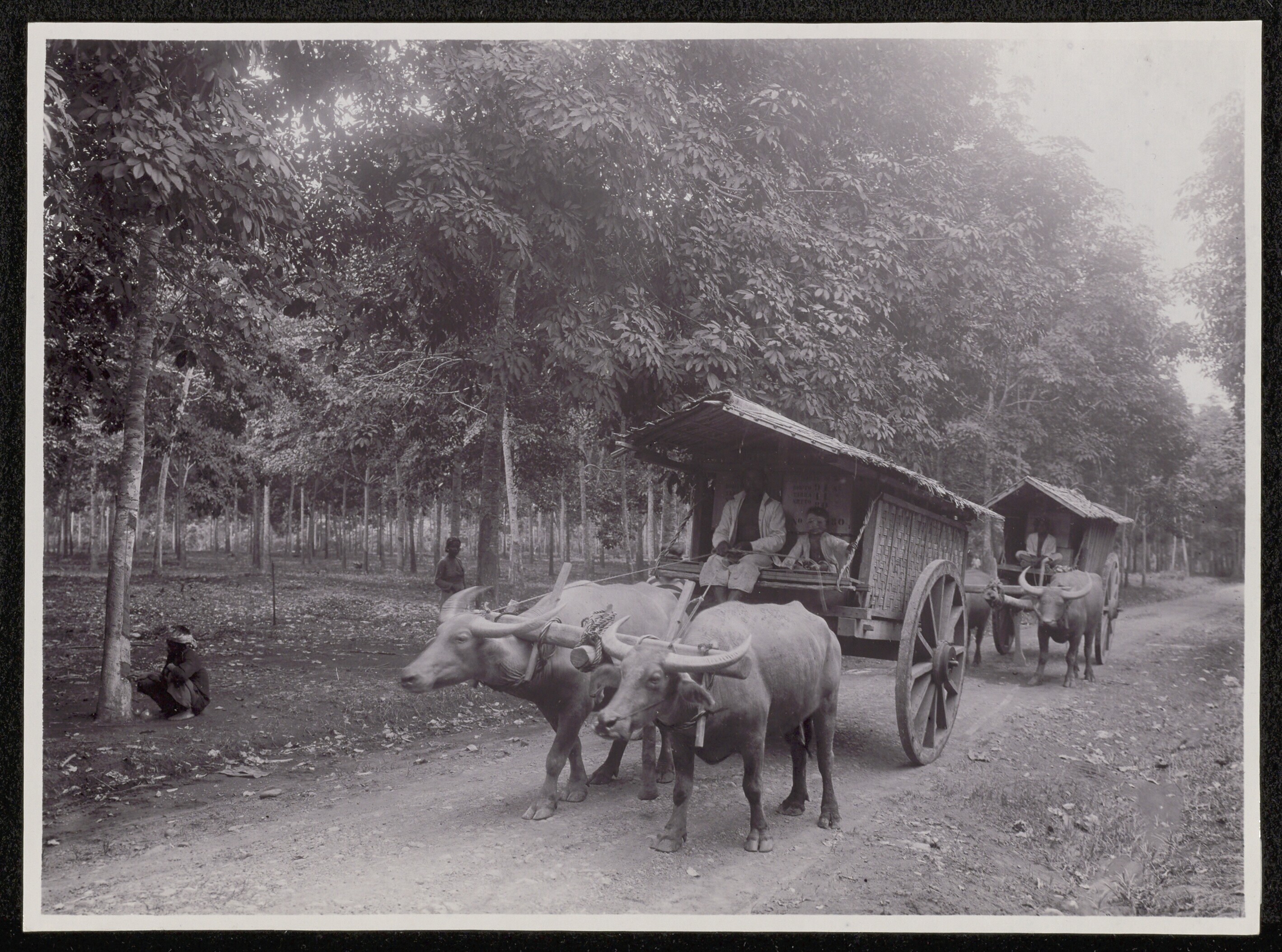 Met kisten vol crêpe beladen ossenkarren rijden lang...