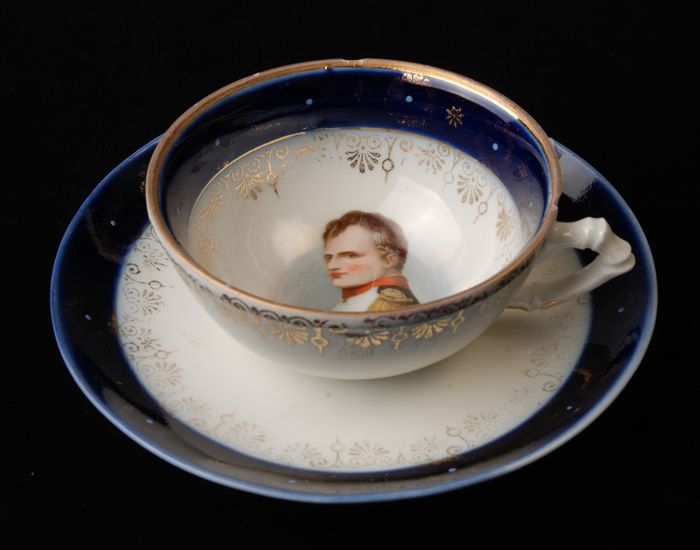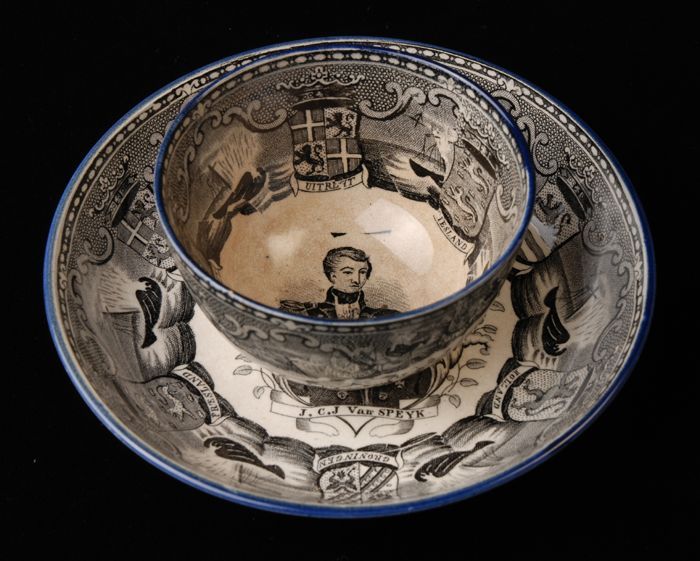Kop en schotel met blauwe rand en in zwart portret J...