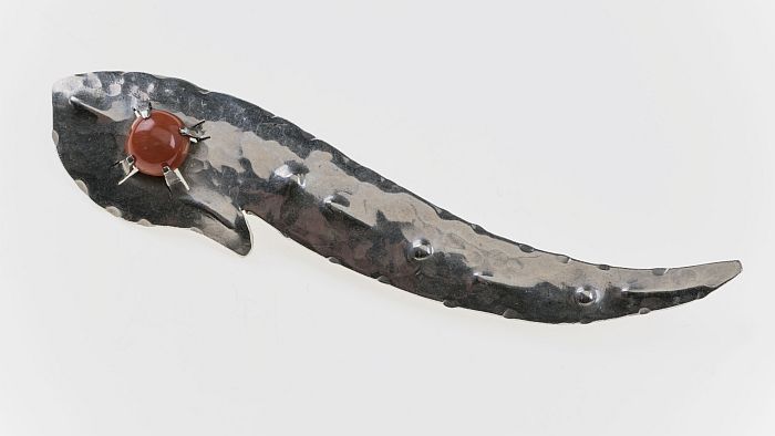 Langwerpige zilverkleurige broche met oranje steen