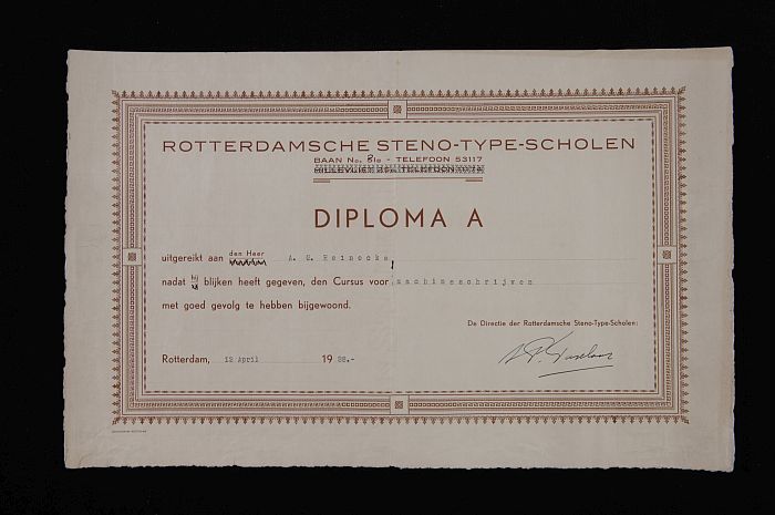 Typediploma van Rotterdamsche Steno Type Scholen, op...