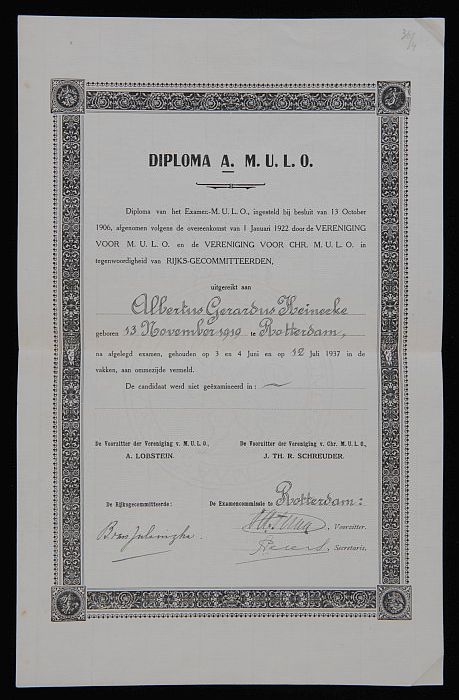 MULO-diploma A van A.G. Heinecke, met op ommezijde d...