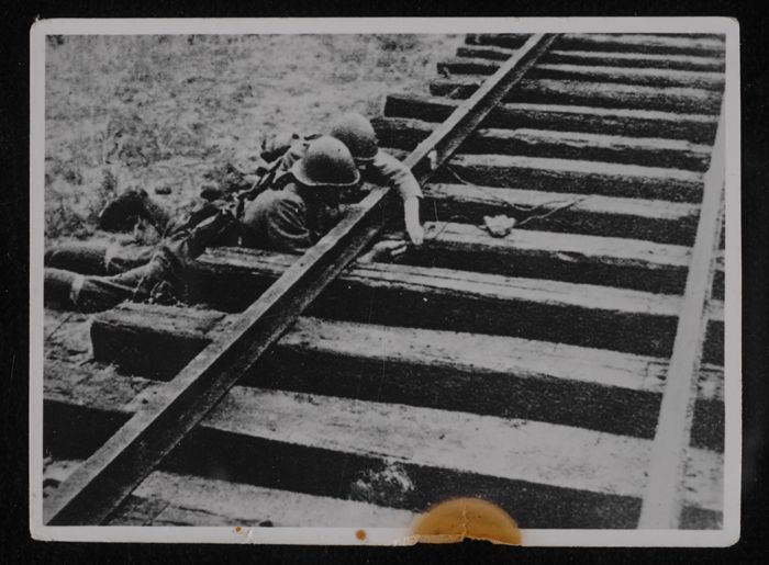 Foto Tweede Wereldoorlog, Rotterdam, twee soldaten b...