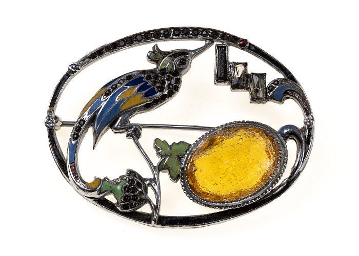 Zilverkleurige metalen broche, vogel in ovaal, in cl...