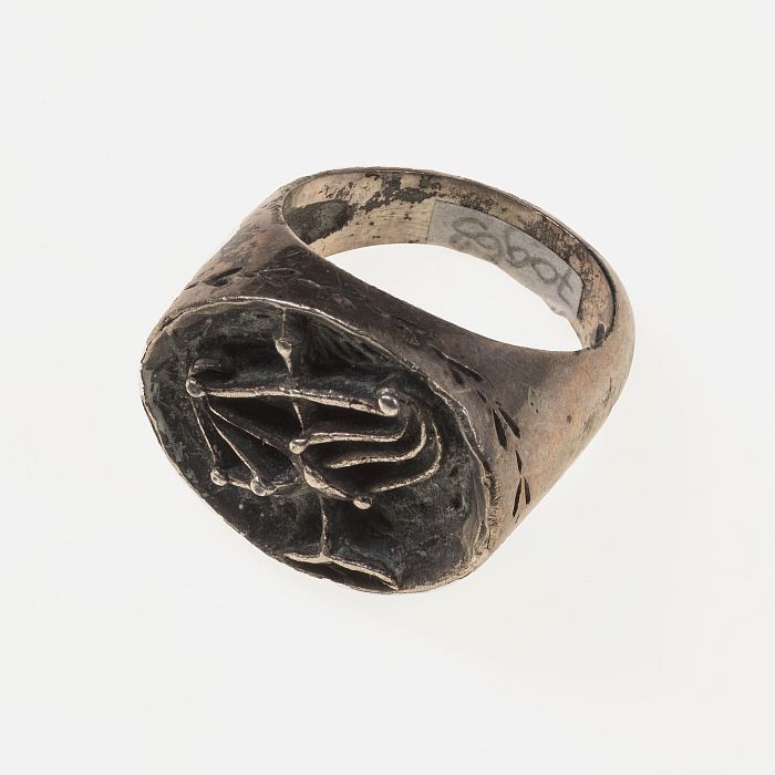 Zilverkleurige metalen ring met een weegschaal