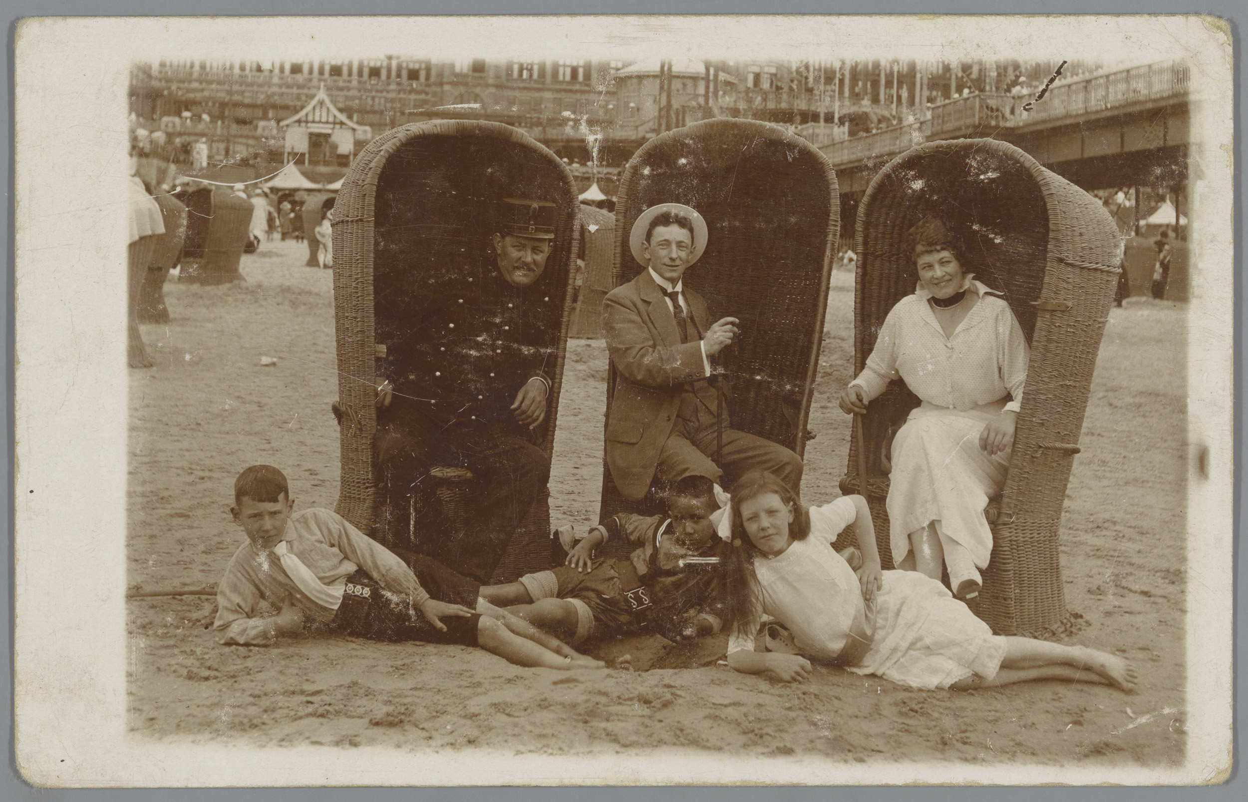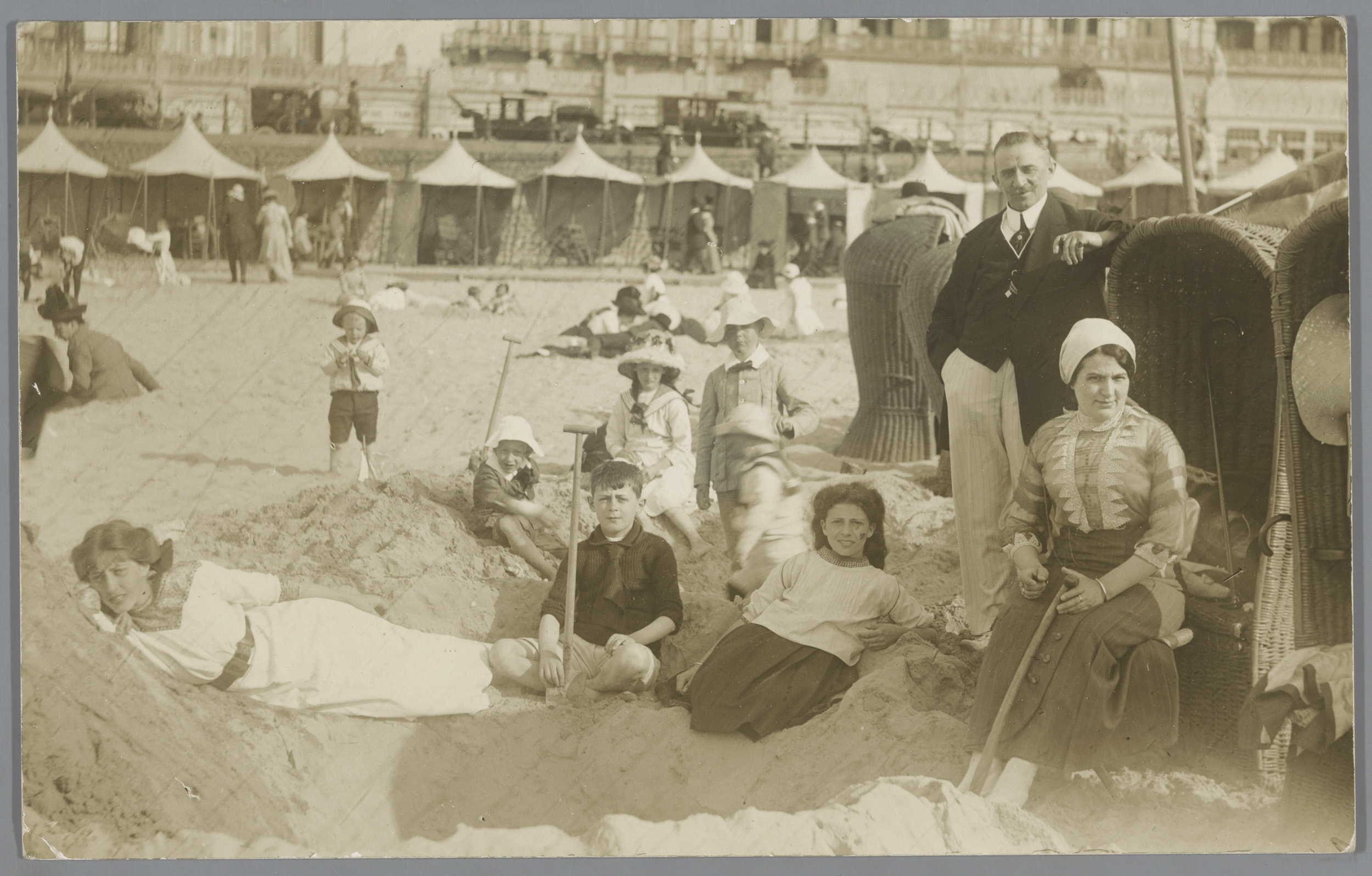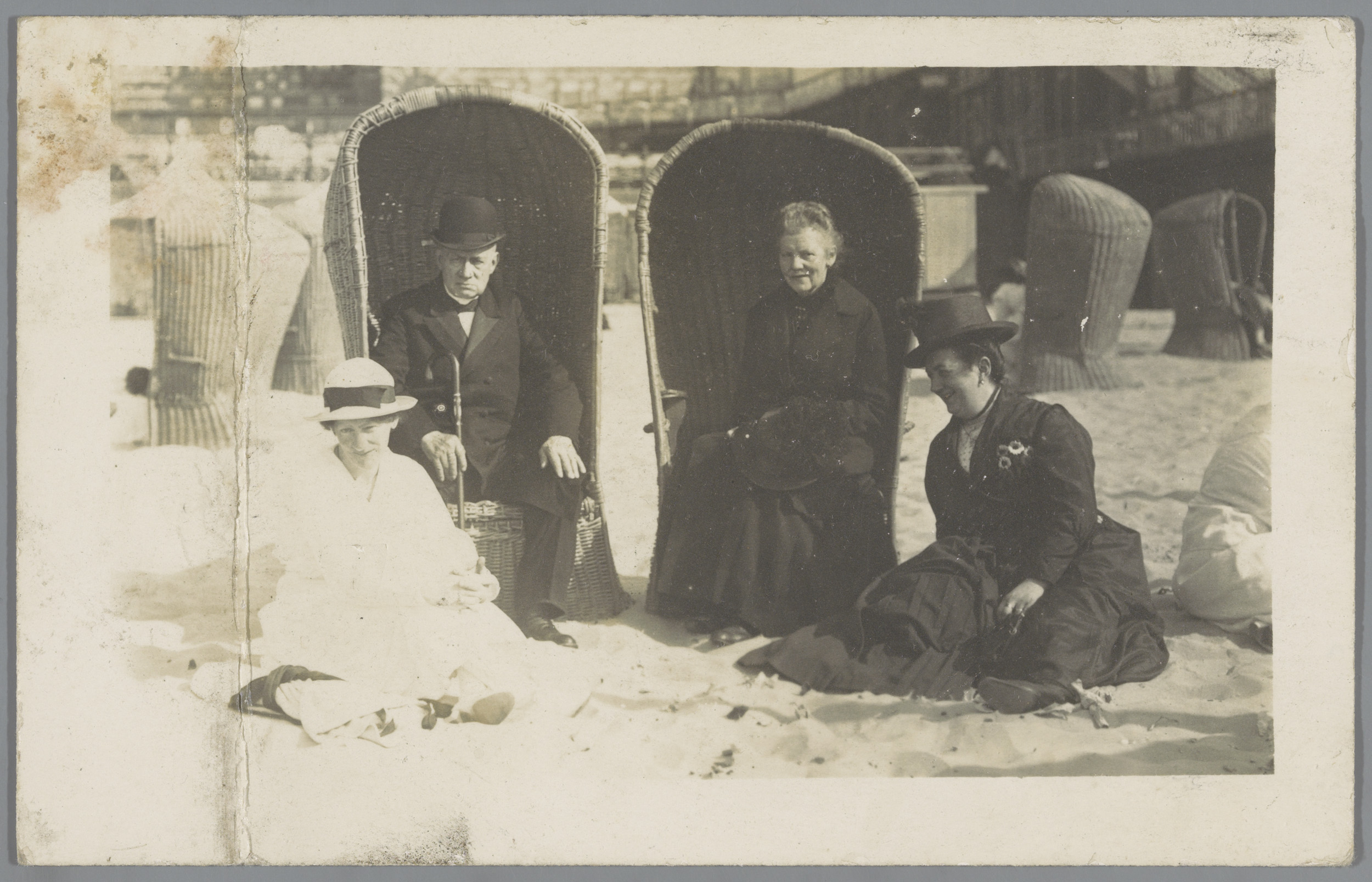 Gezicht op een strand met badkoetsen (vermoedelijk) ...