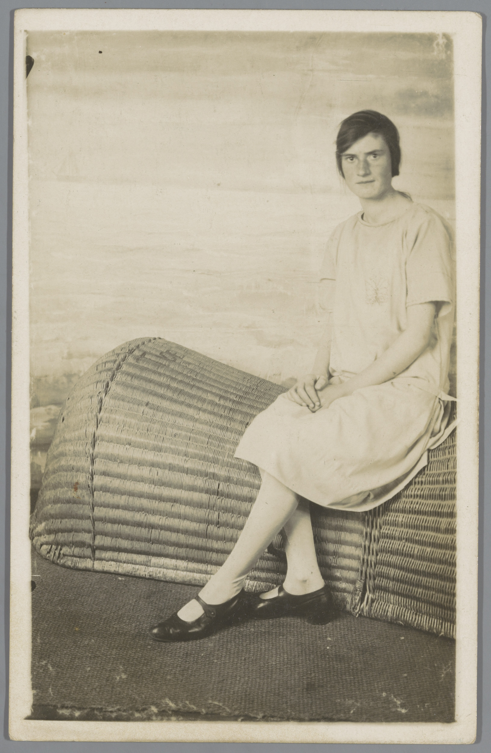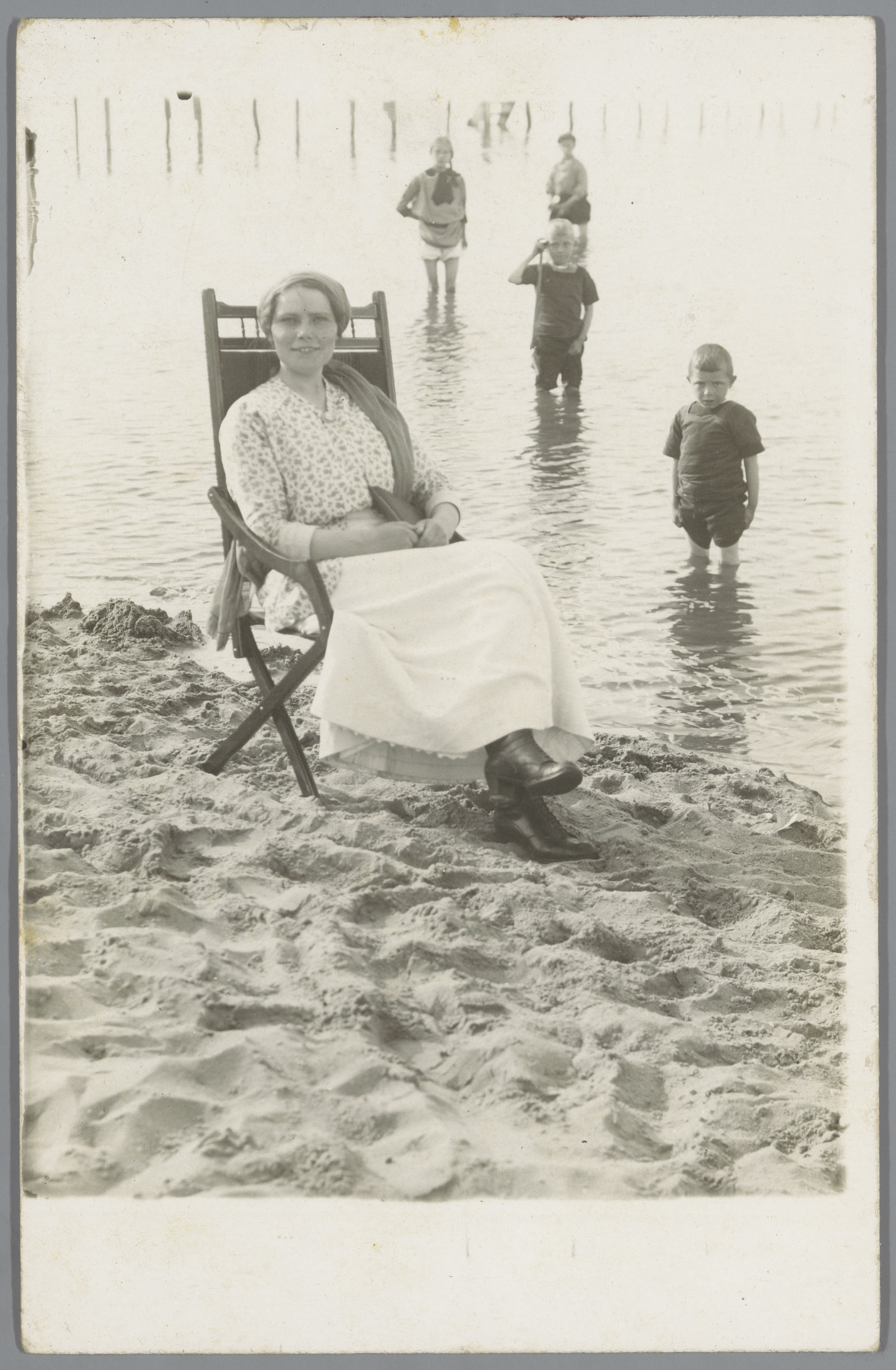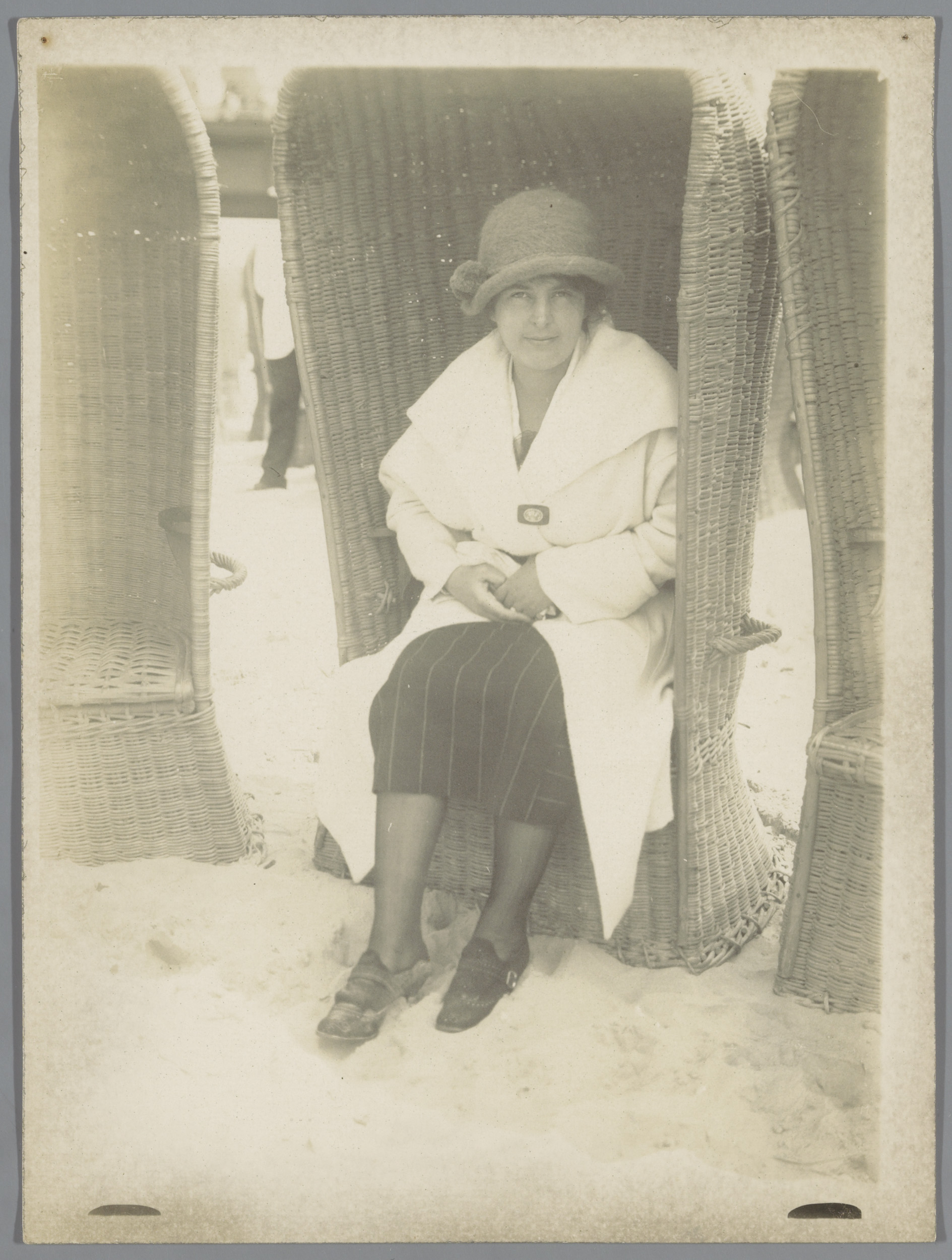 Portret van een onbekende vrouw in een vouwstoel op ...