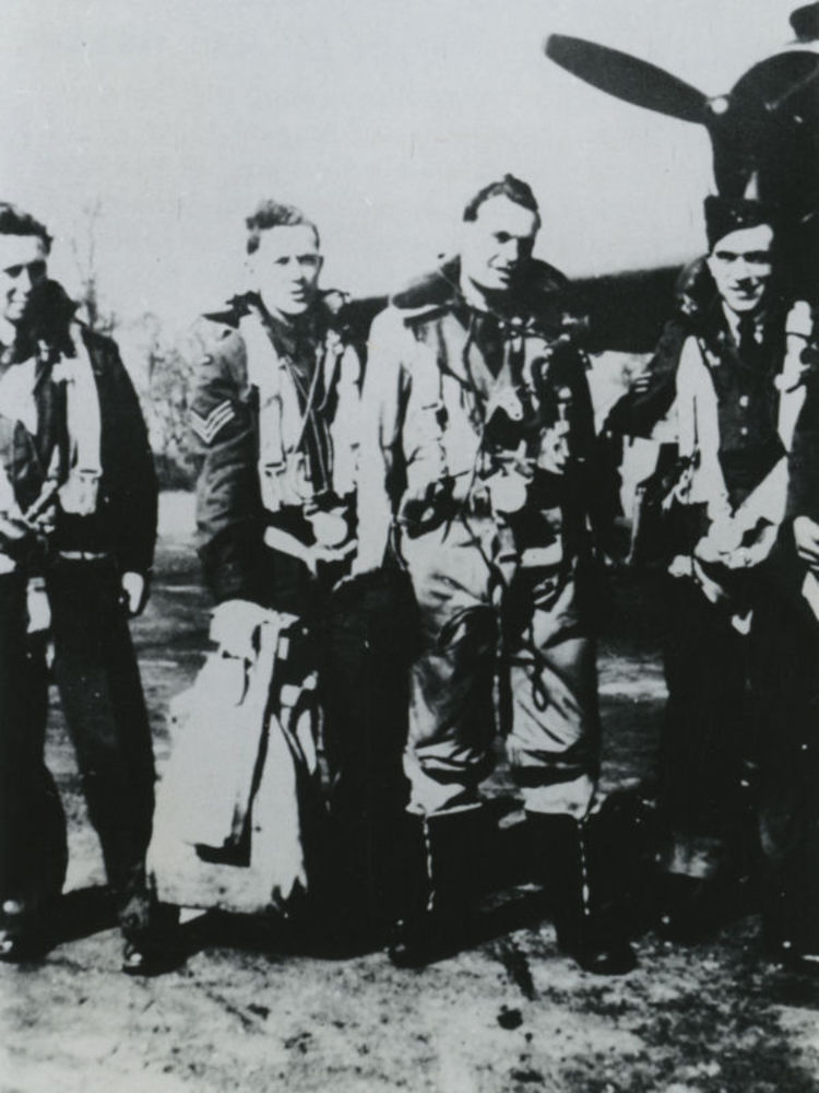 Foto vier mannen in R.A.F. uniform of vliegpak. Teks...