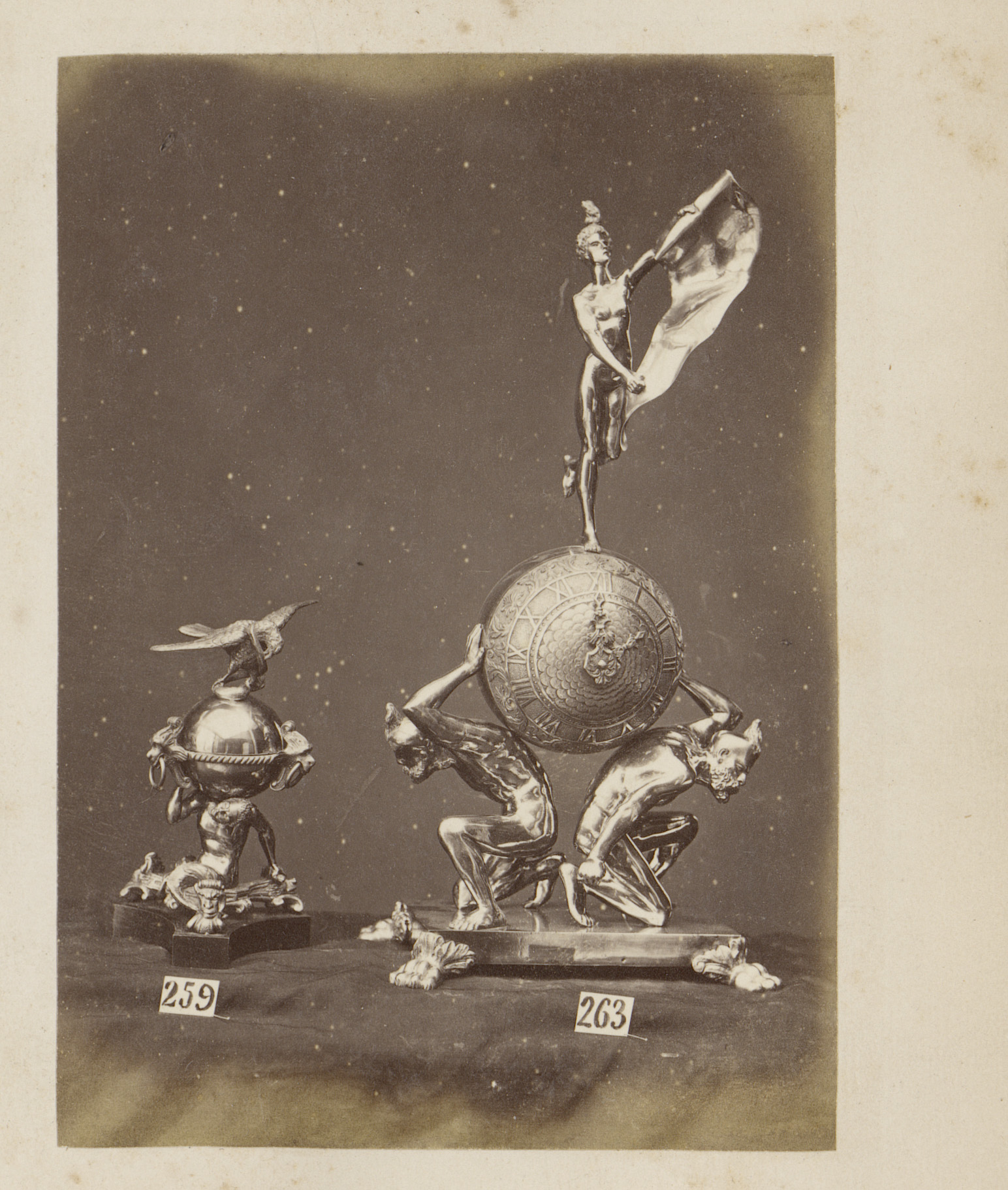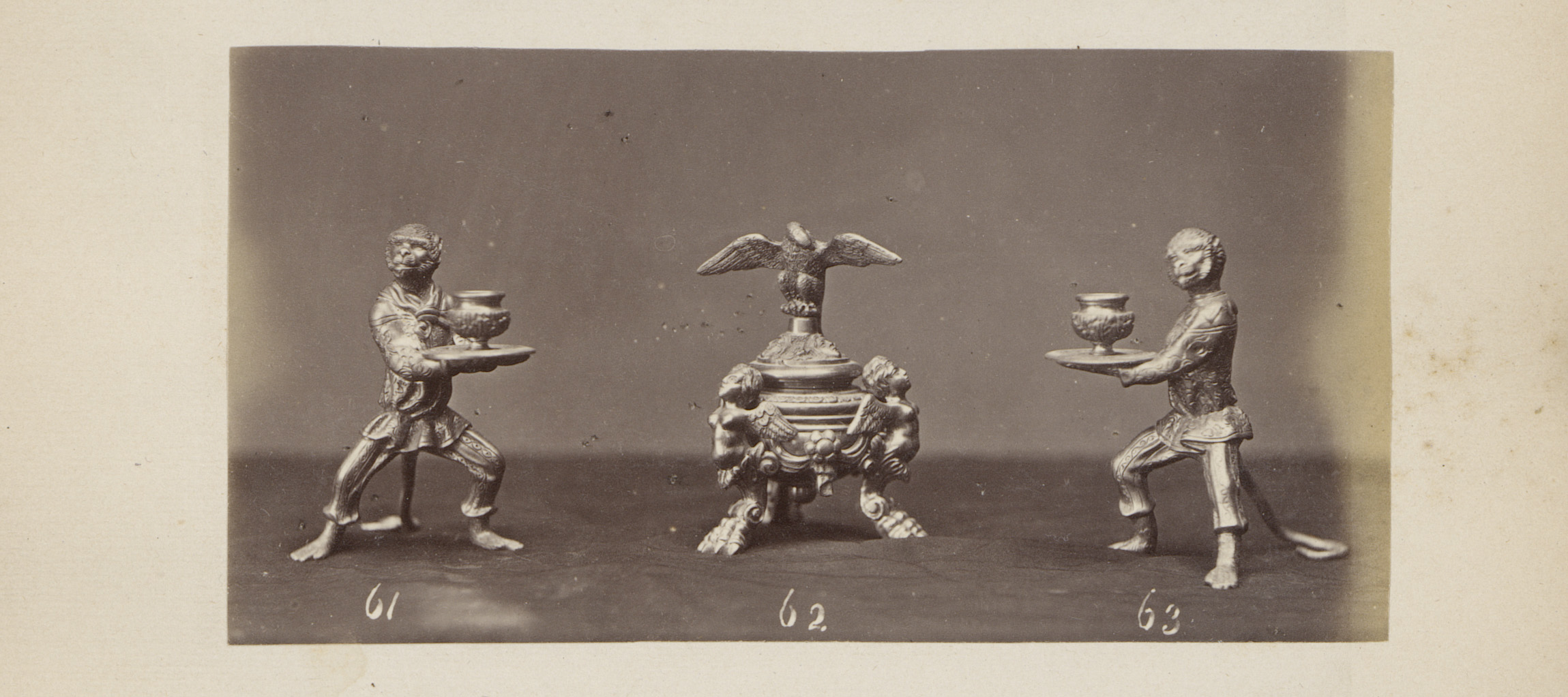 Metalen kandelaars in de vorm van apen en een adelaar