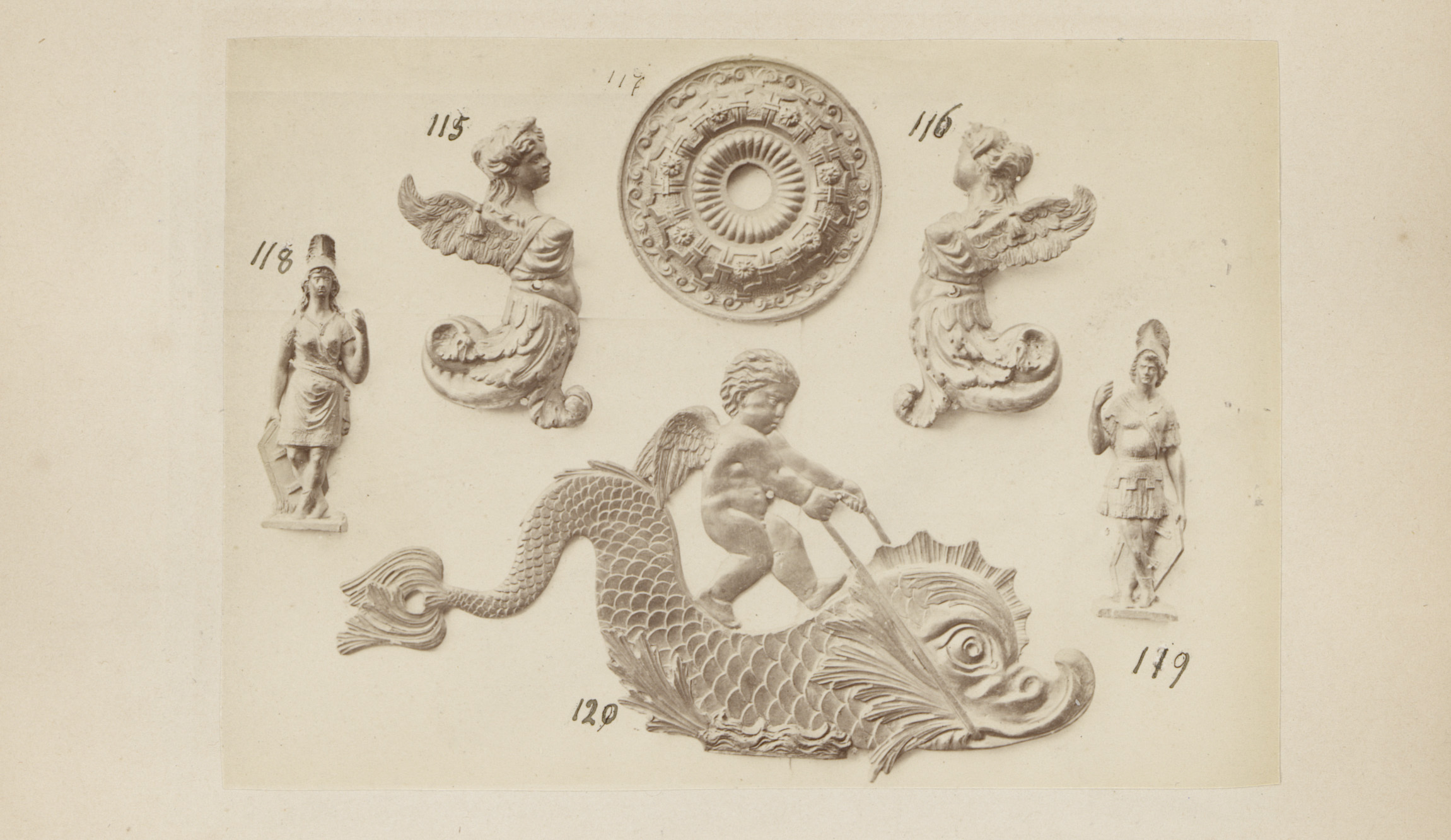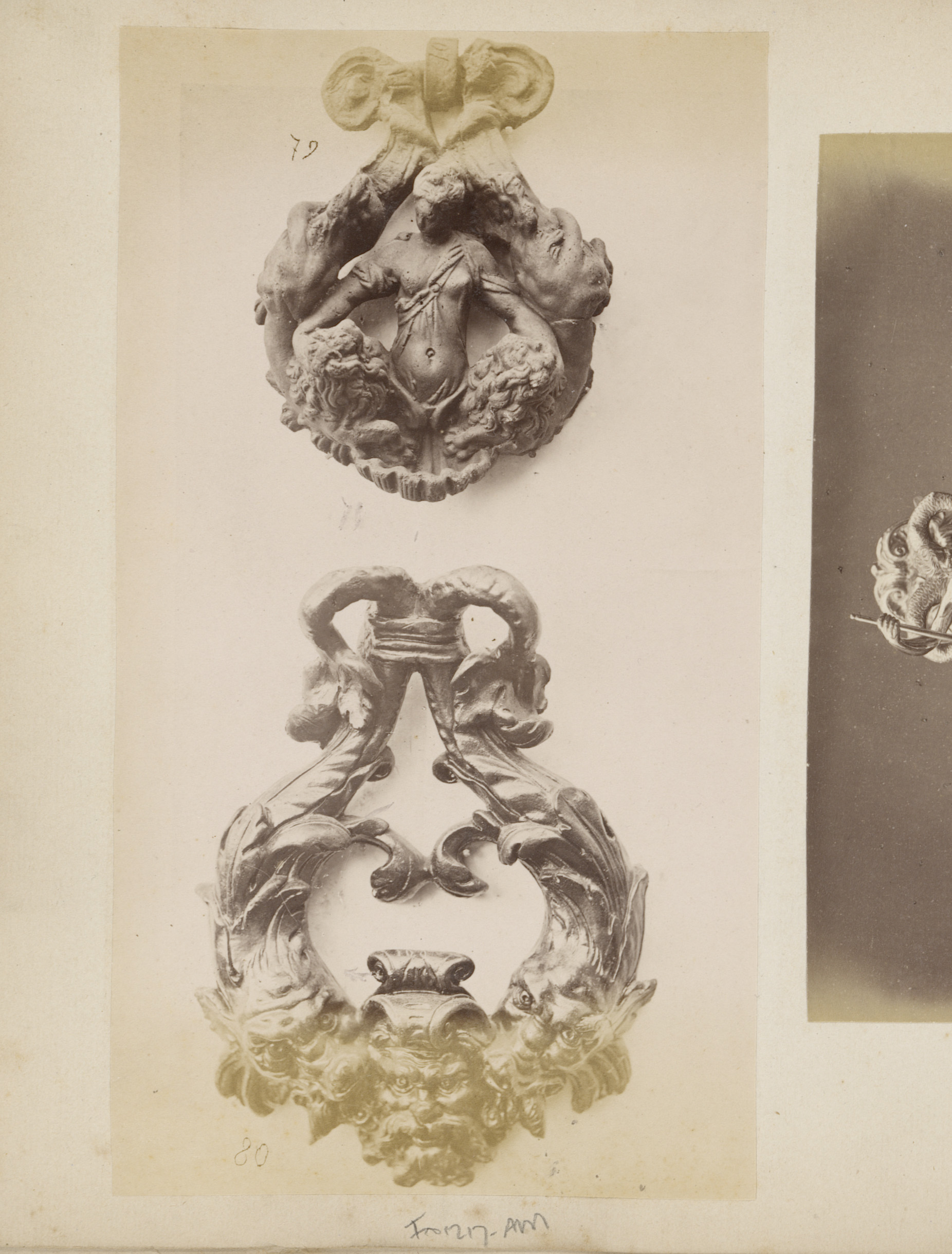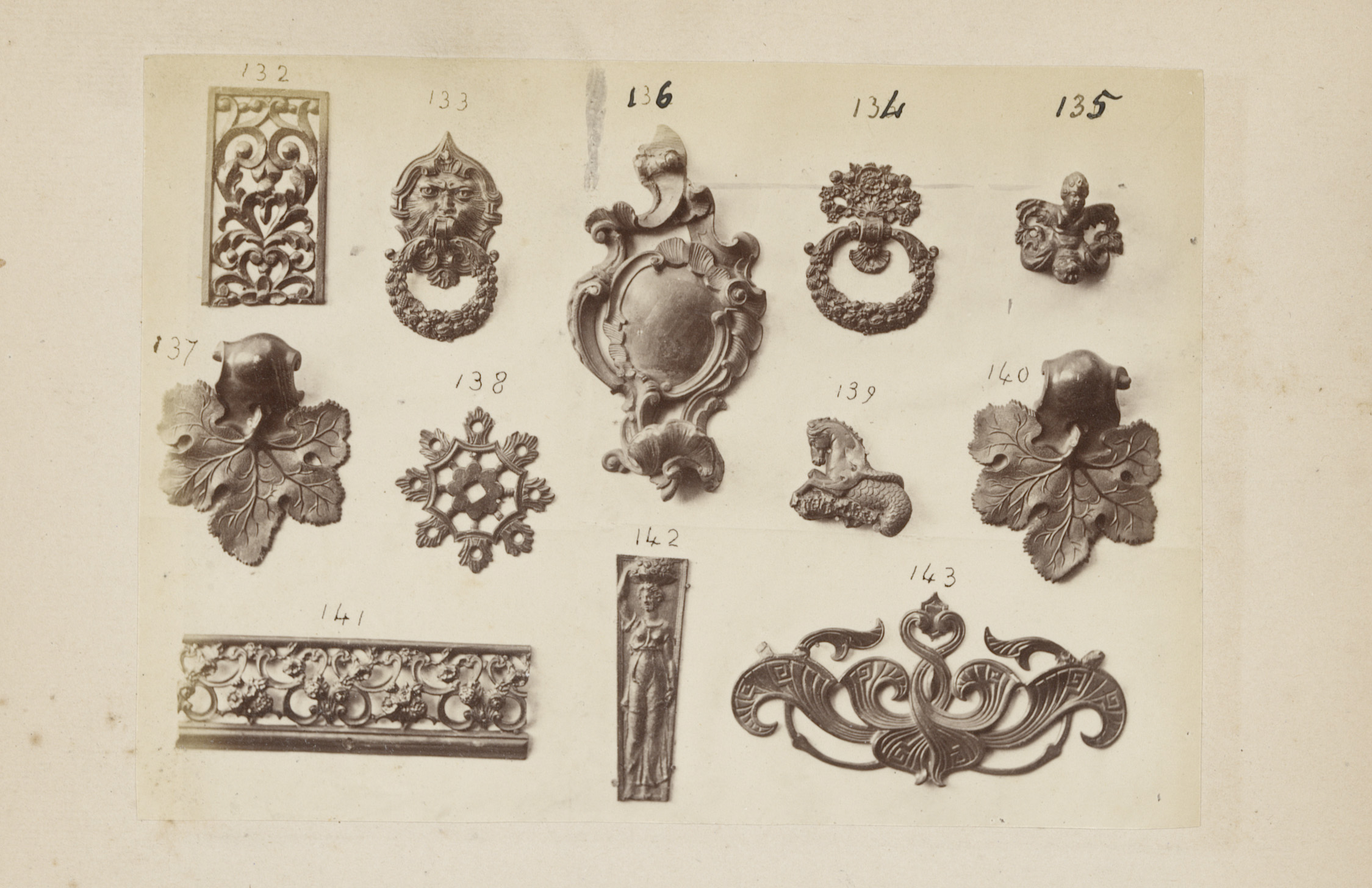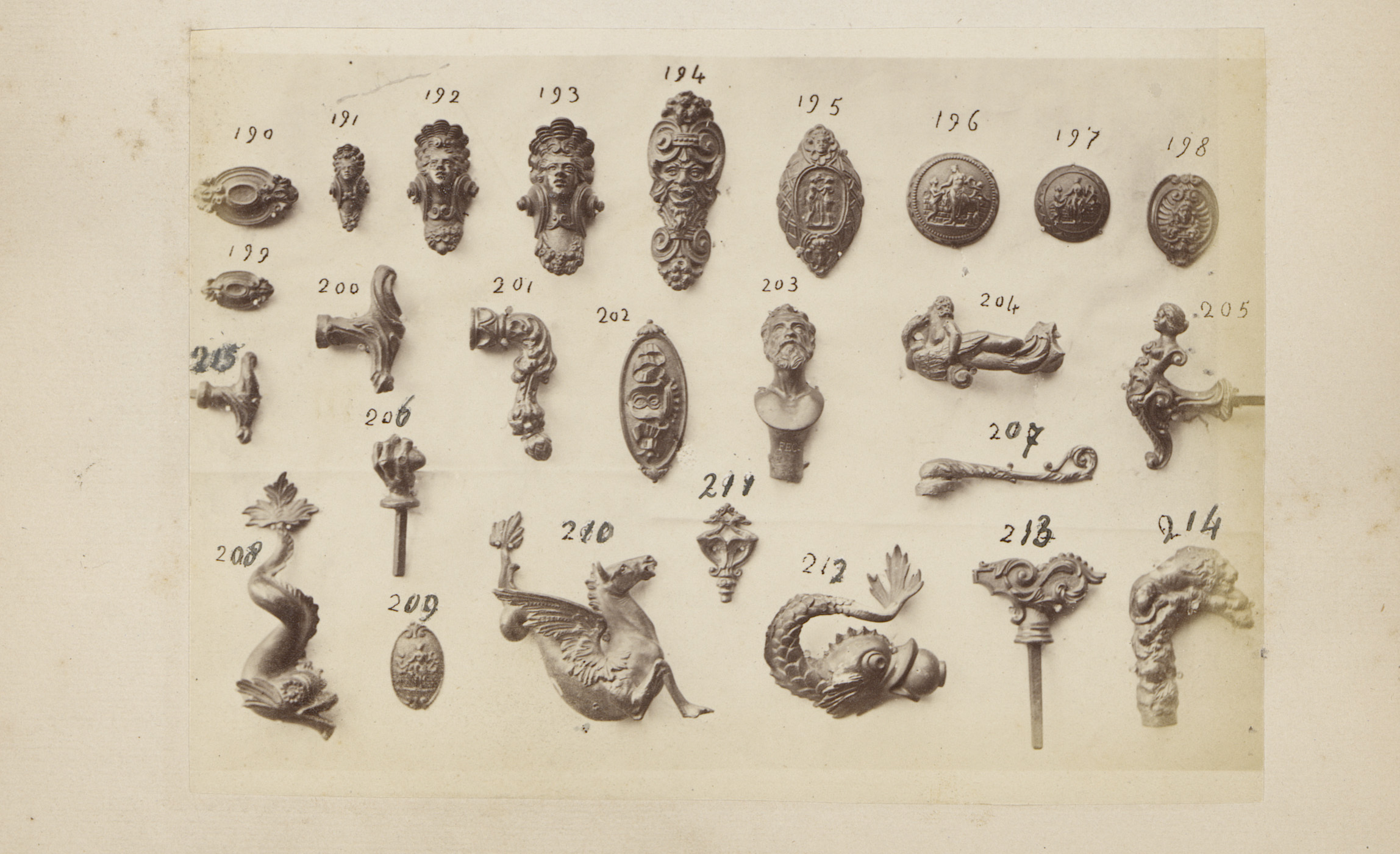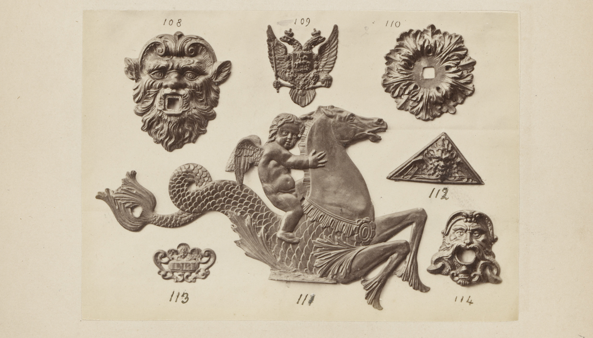 Metalen ornamenten in de vorm van koppen en zeepaarden