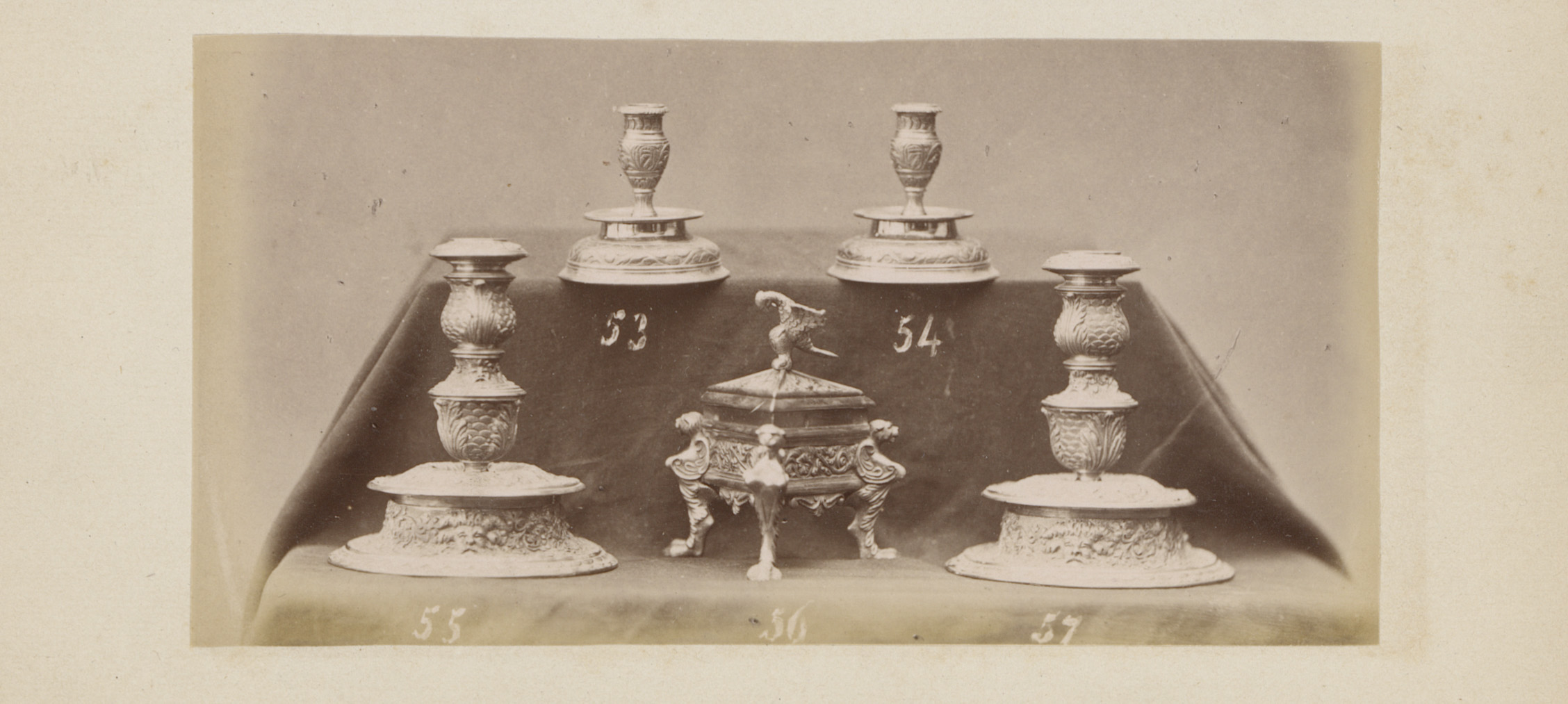Metalen kandelaars en inktpot