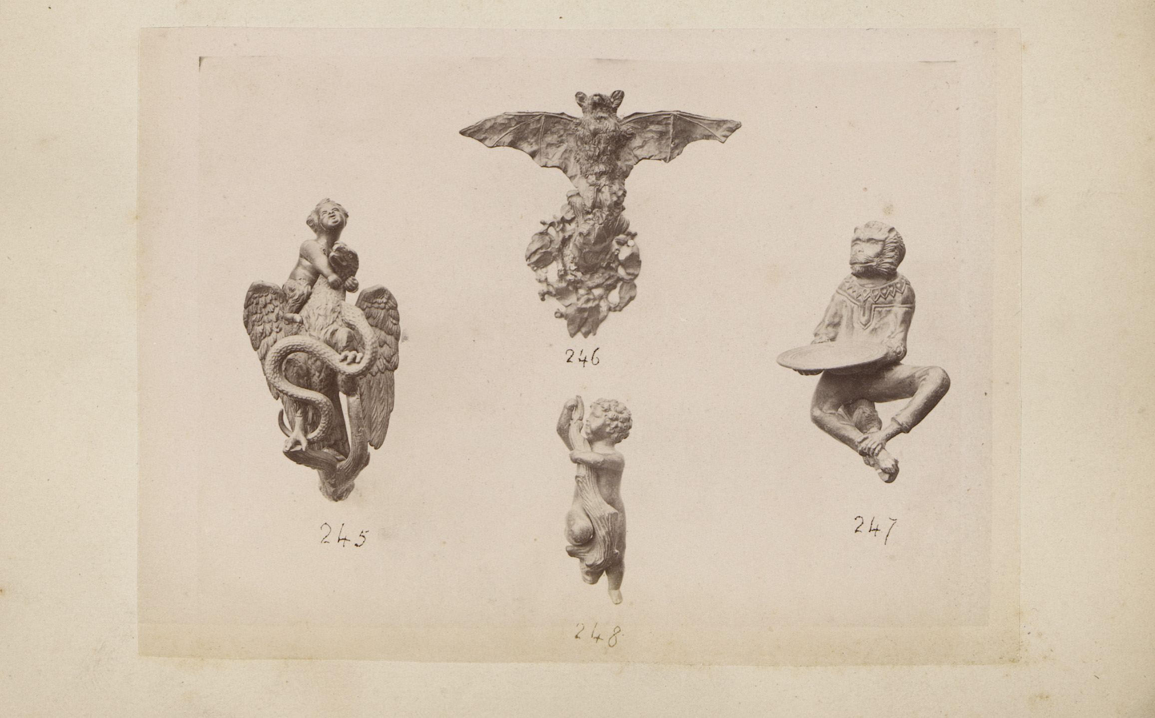 Metalen sculpturen van een vleermuis, een aap en naa...
