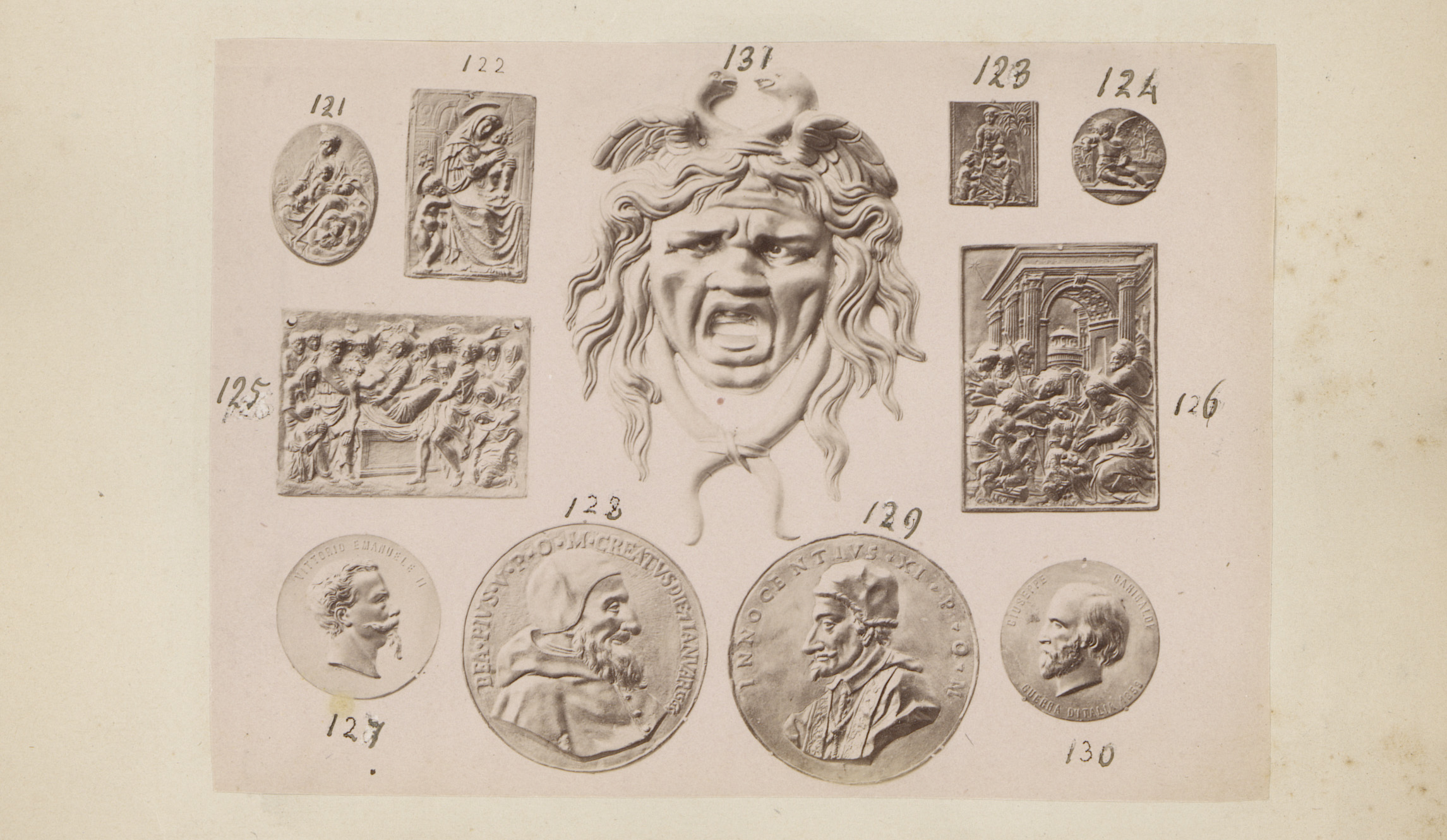 Metalen plaquettes en munten en een Medusakop