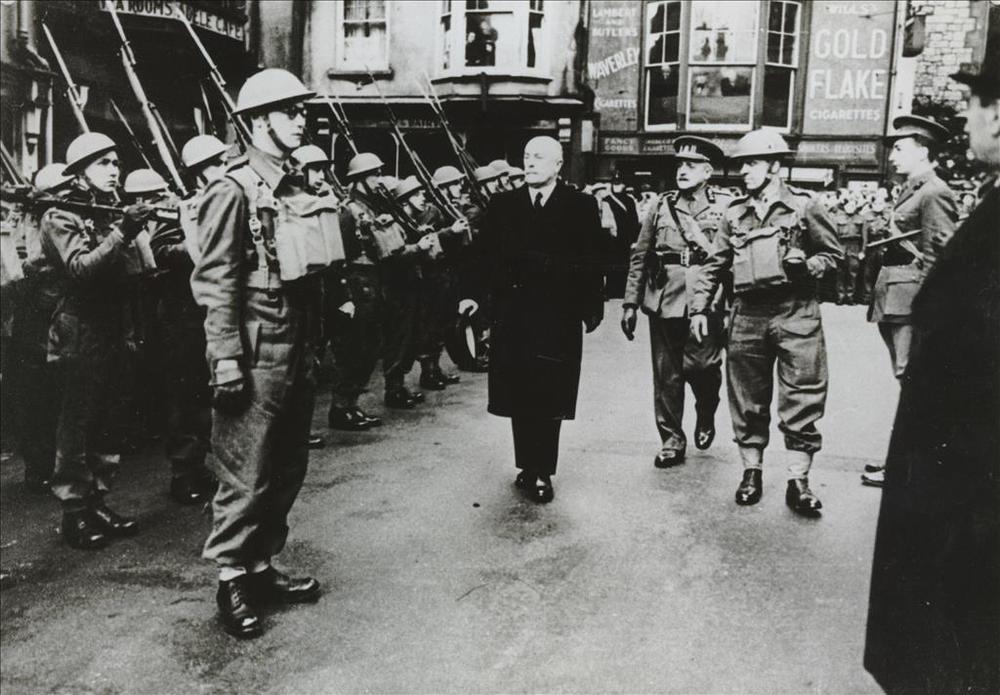 Soldaten rond een Y.M.C.A. tea car in overstroomd Elst.