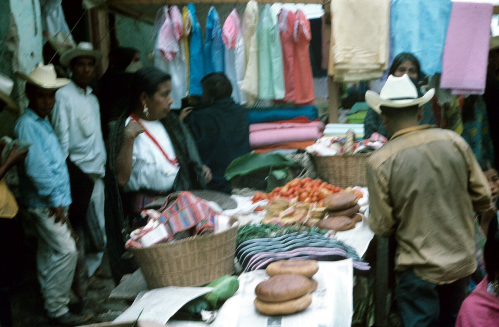 textiel, broden en groenten op markt