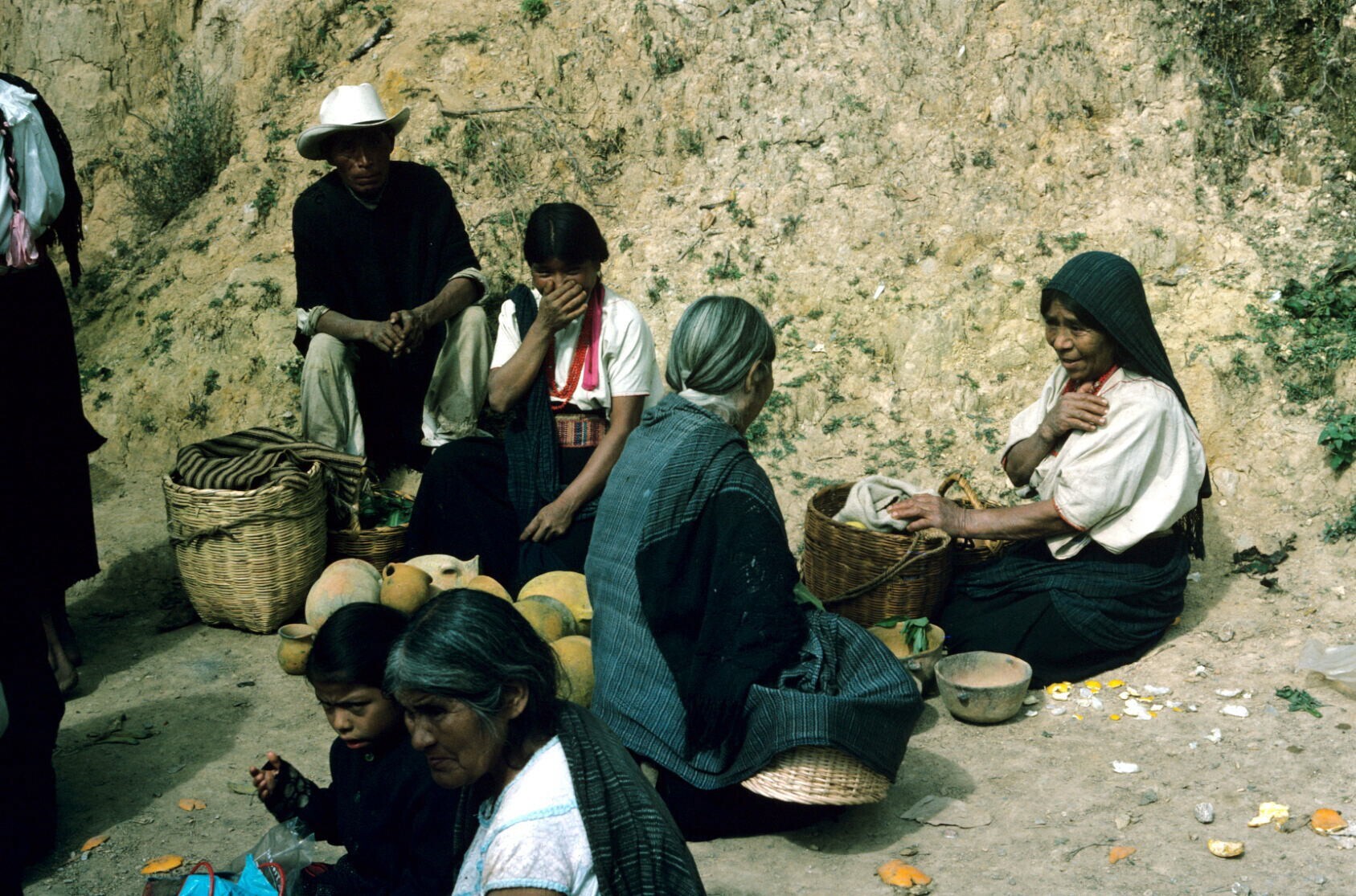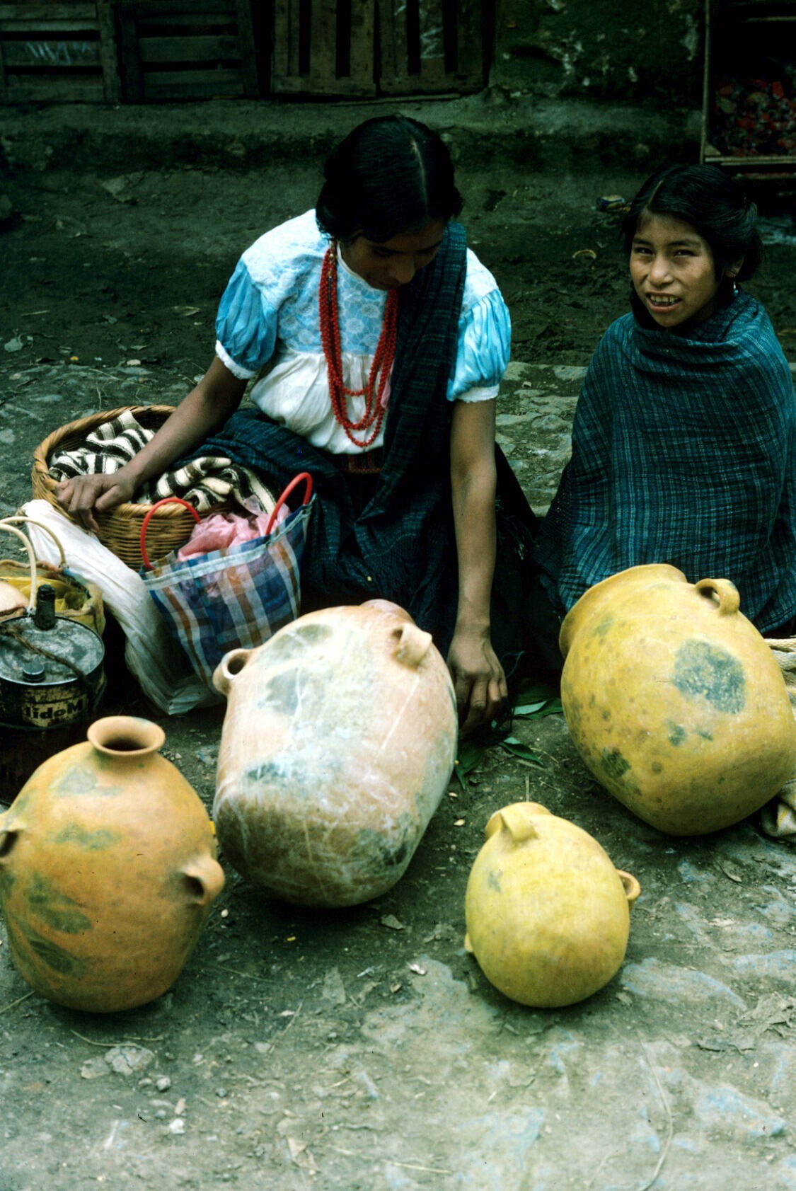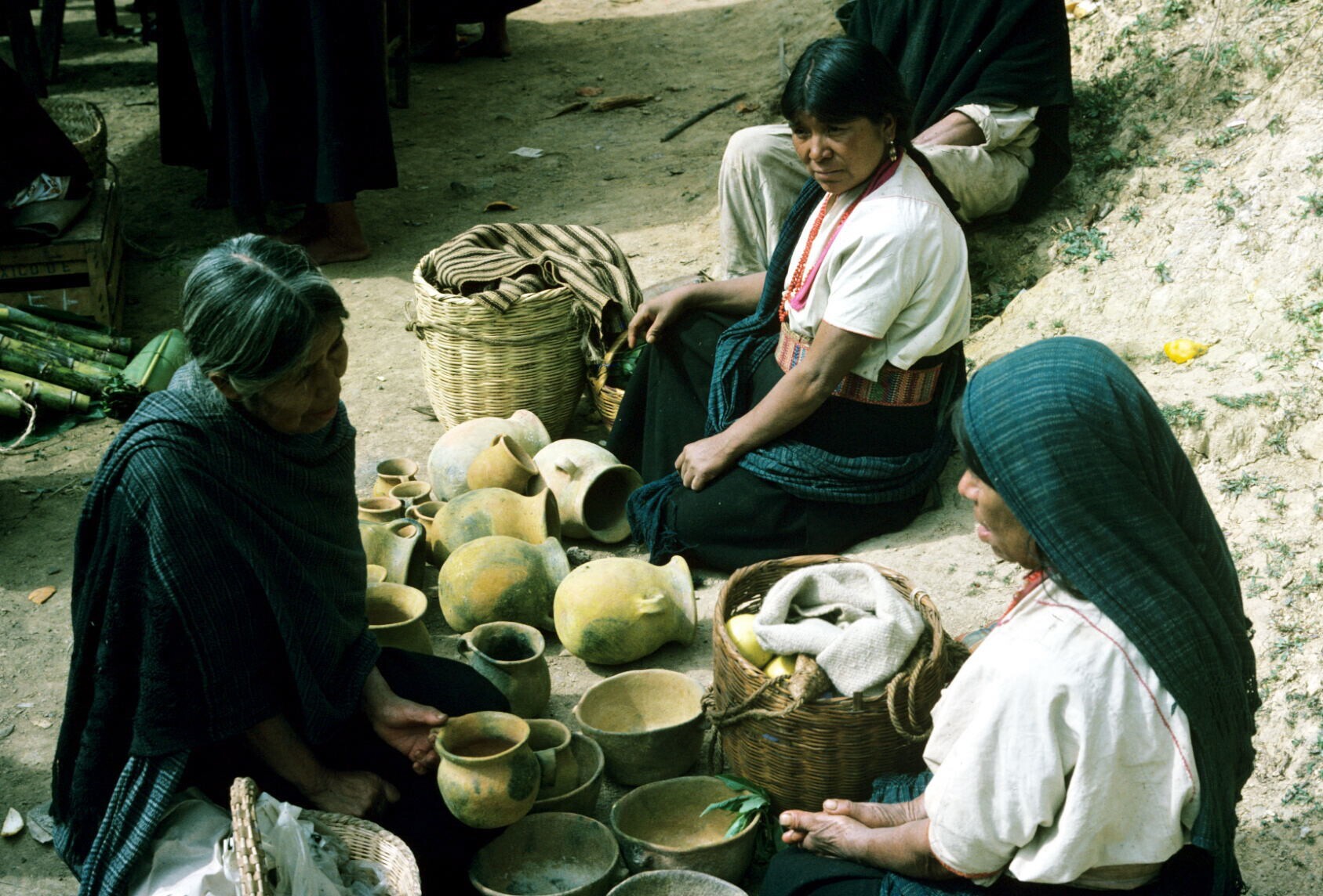 marktvrouwen met koopwaar: aardewerk potten