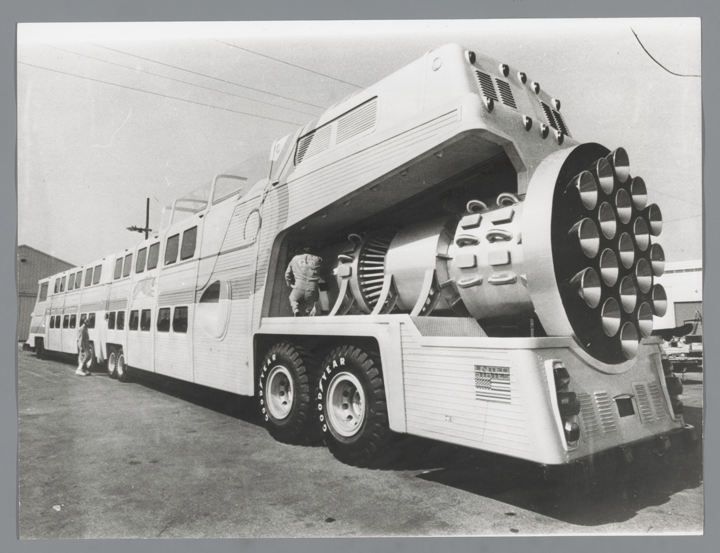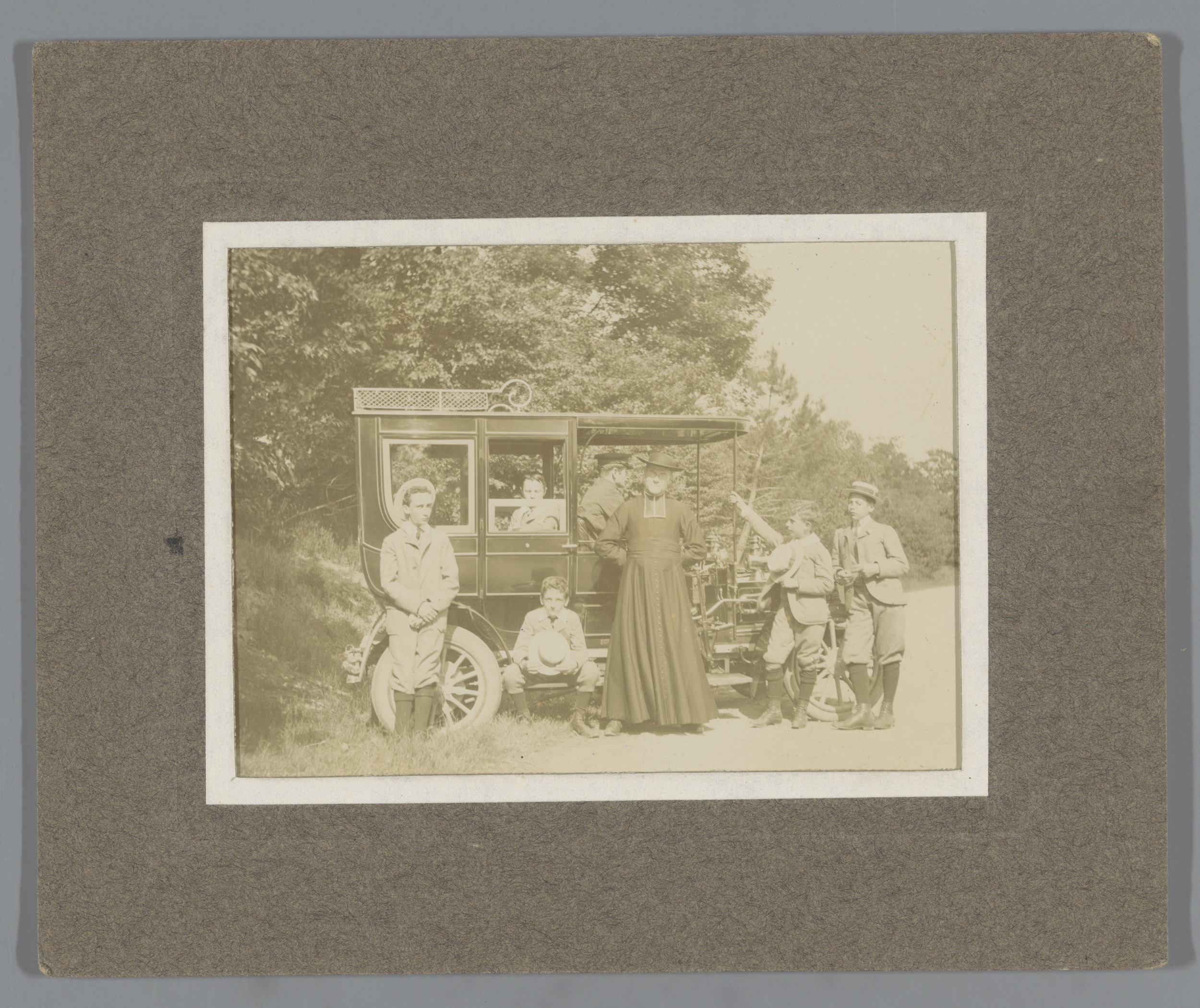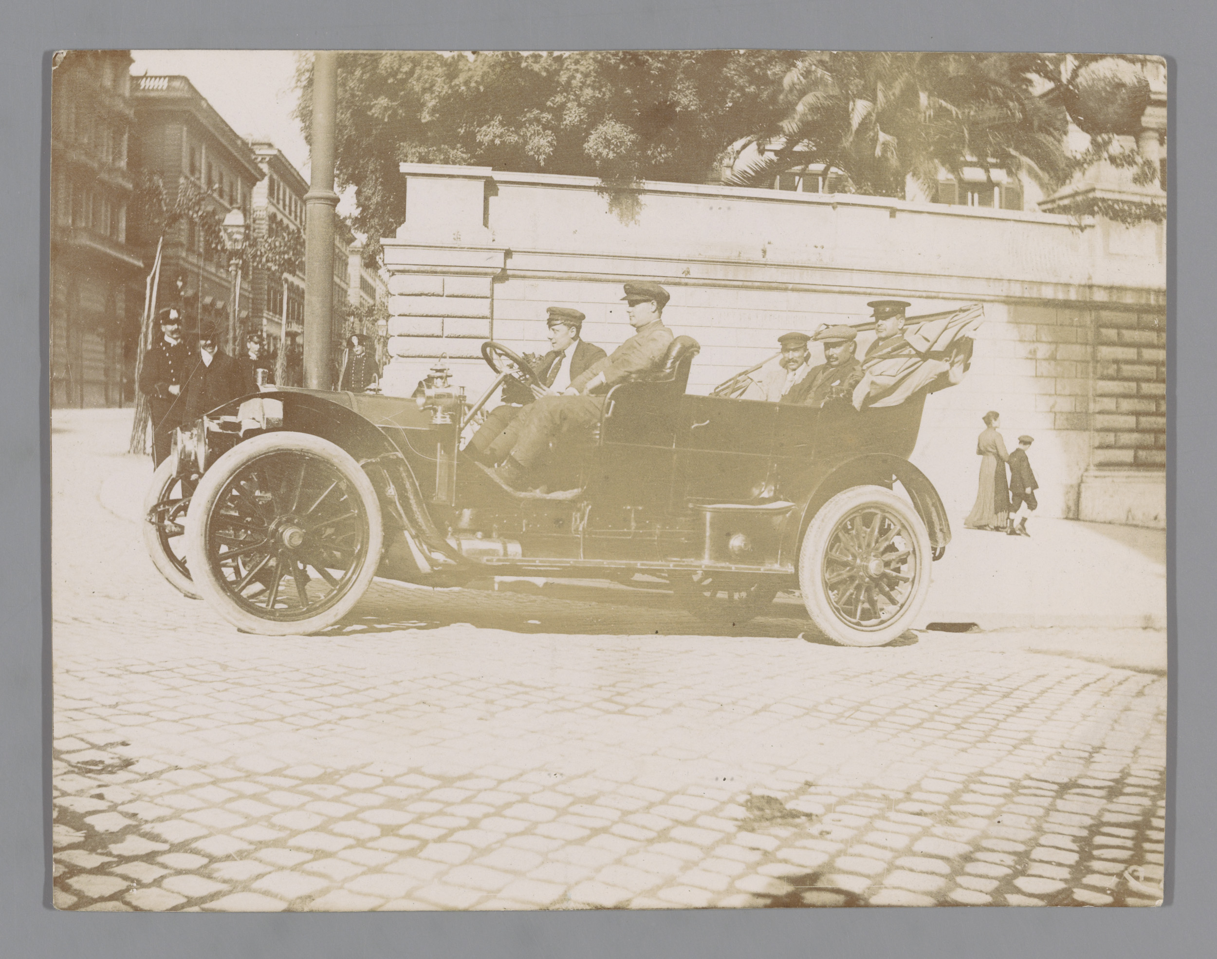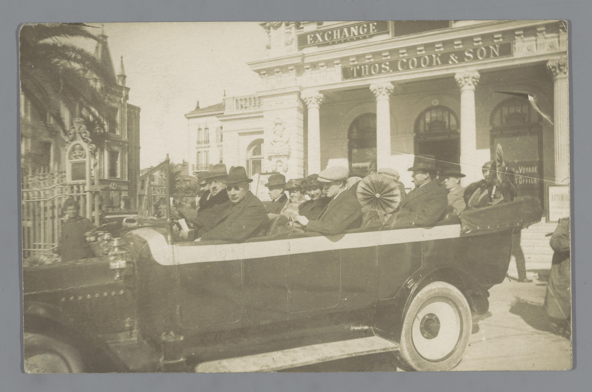 Gezelschap in een open rondvaartauto voor de Dom van...