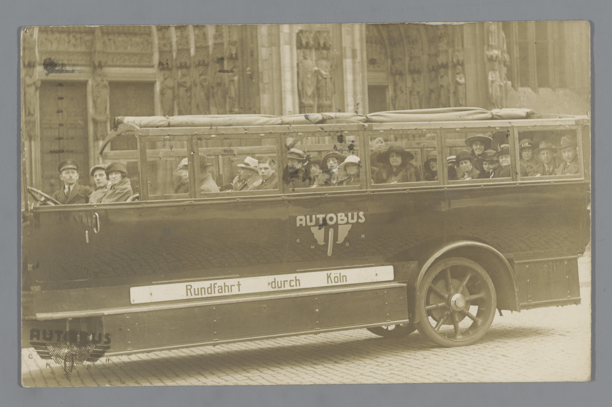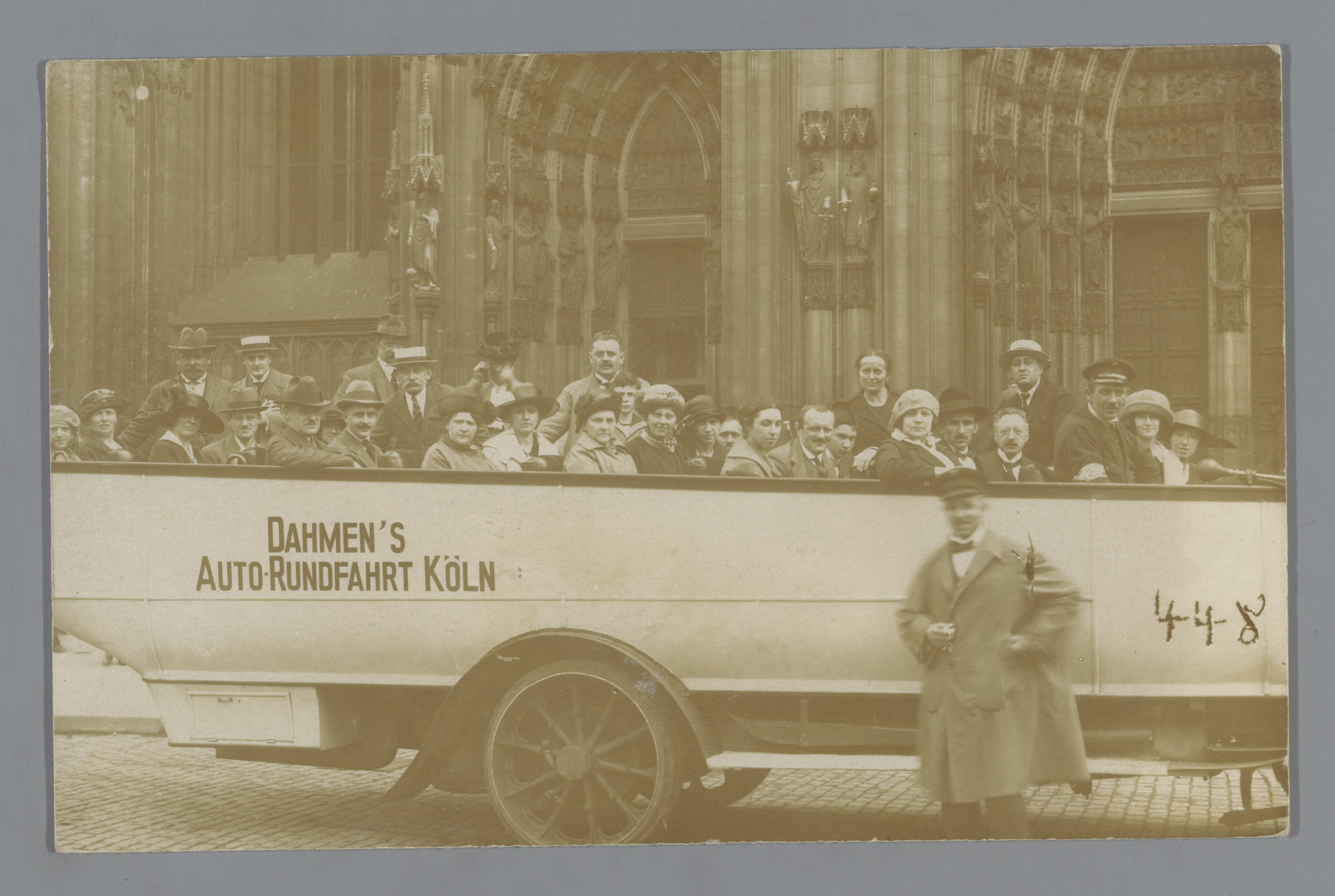 Gezelschap in een rondvaartauto voor de Dom van Keulen