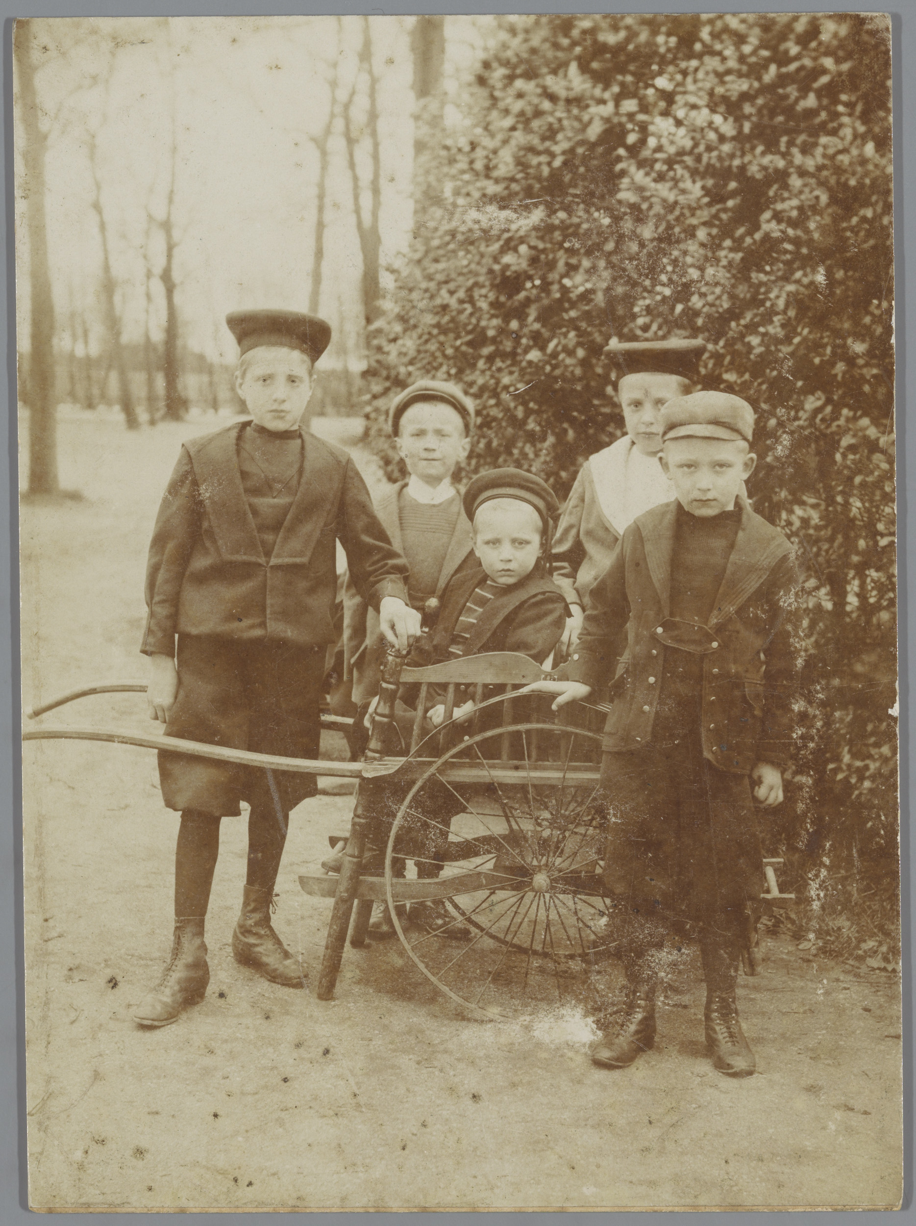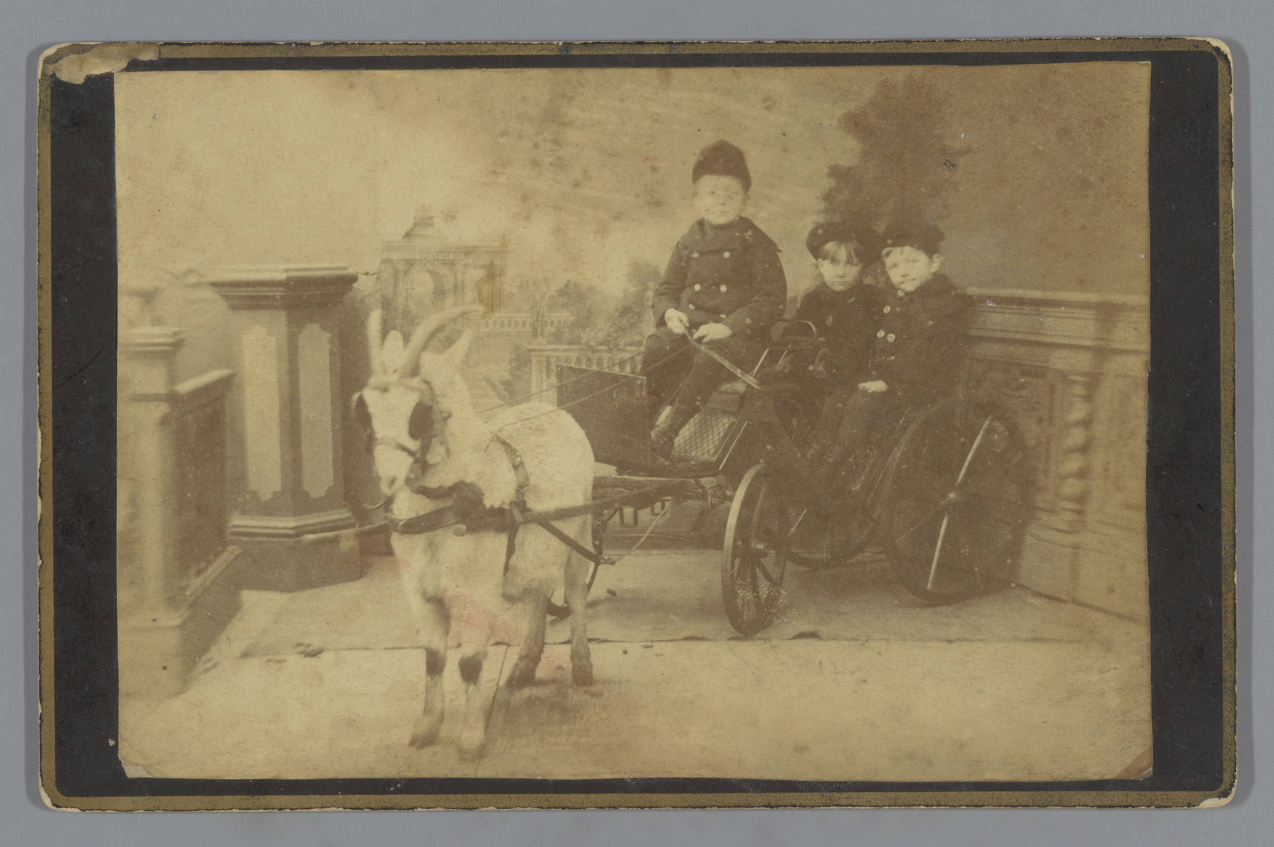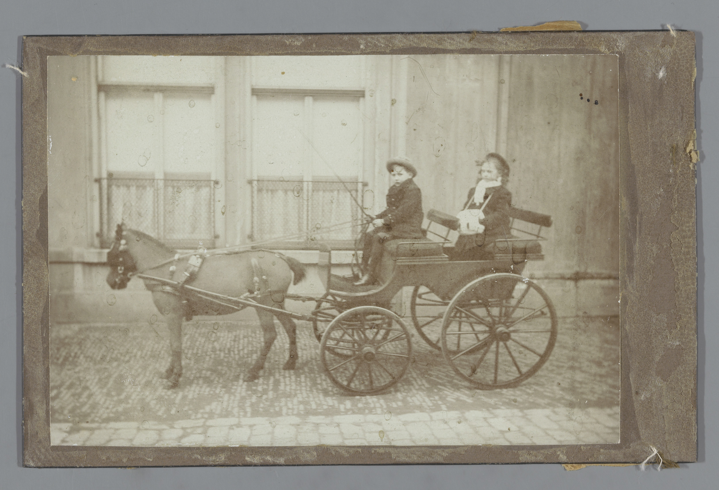 Zes kinderen in een paardenkoets met aan weerszijden...