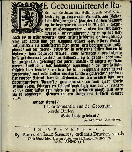 Bekendmaking autorisatie pachter van impost, 1718