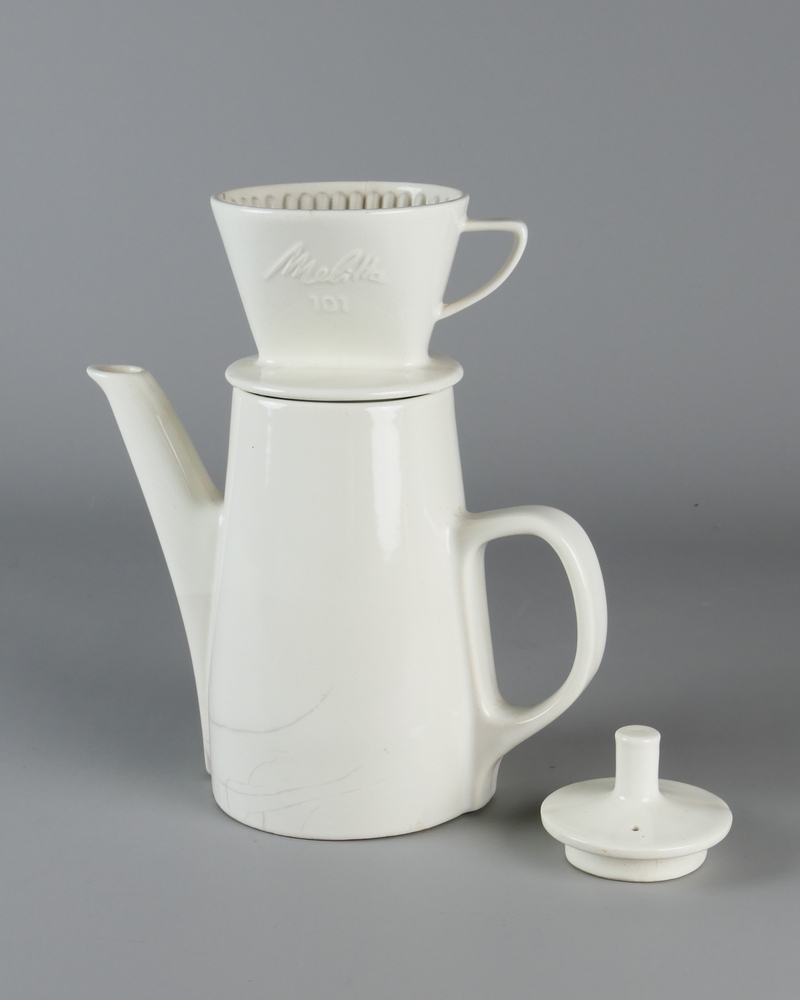 koffiepot met deksel en filter van steengoed in witt...