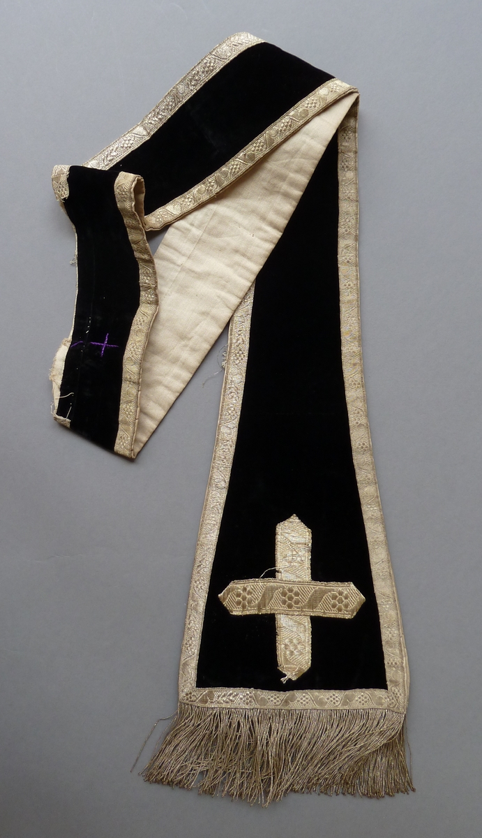 Zwarte stola met zilvergalon en franje, paars kruisj...