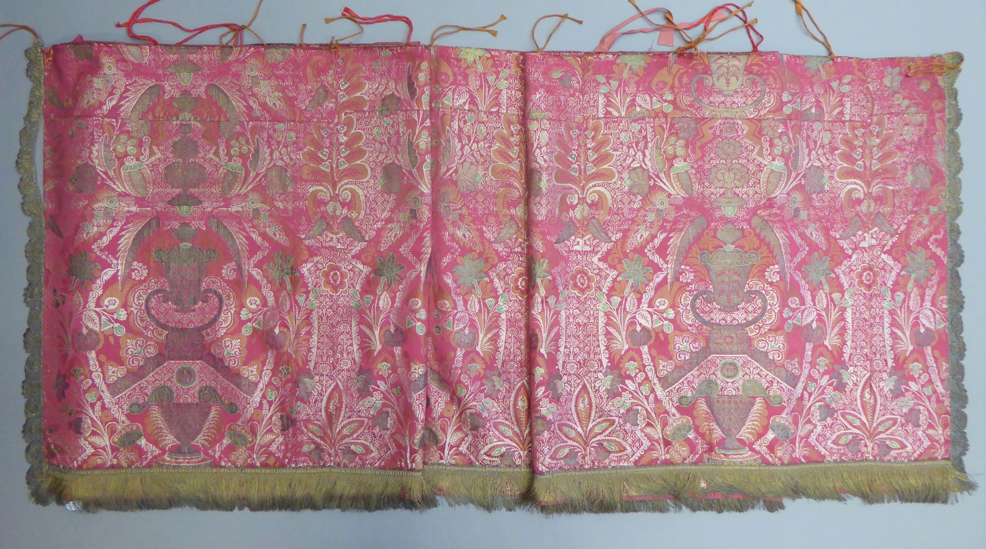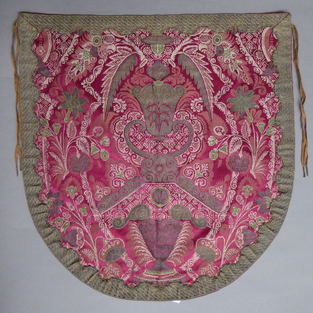Rood koorkapschild van zijdebrokaat met ingeweven pa...
