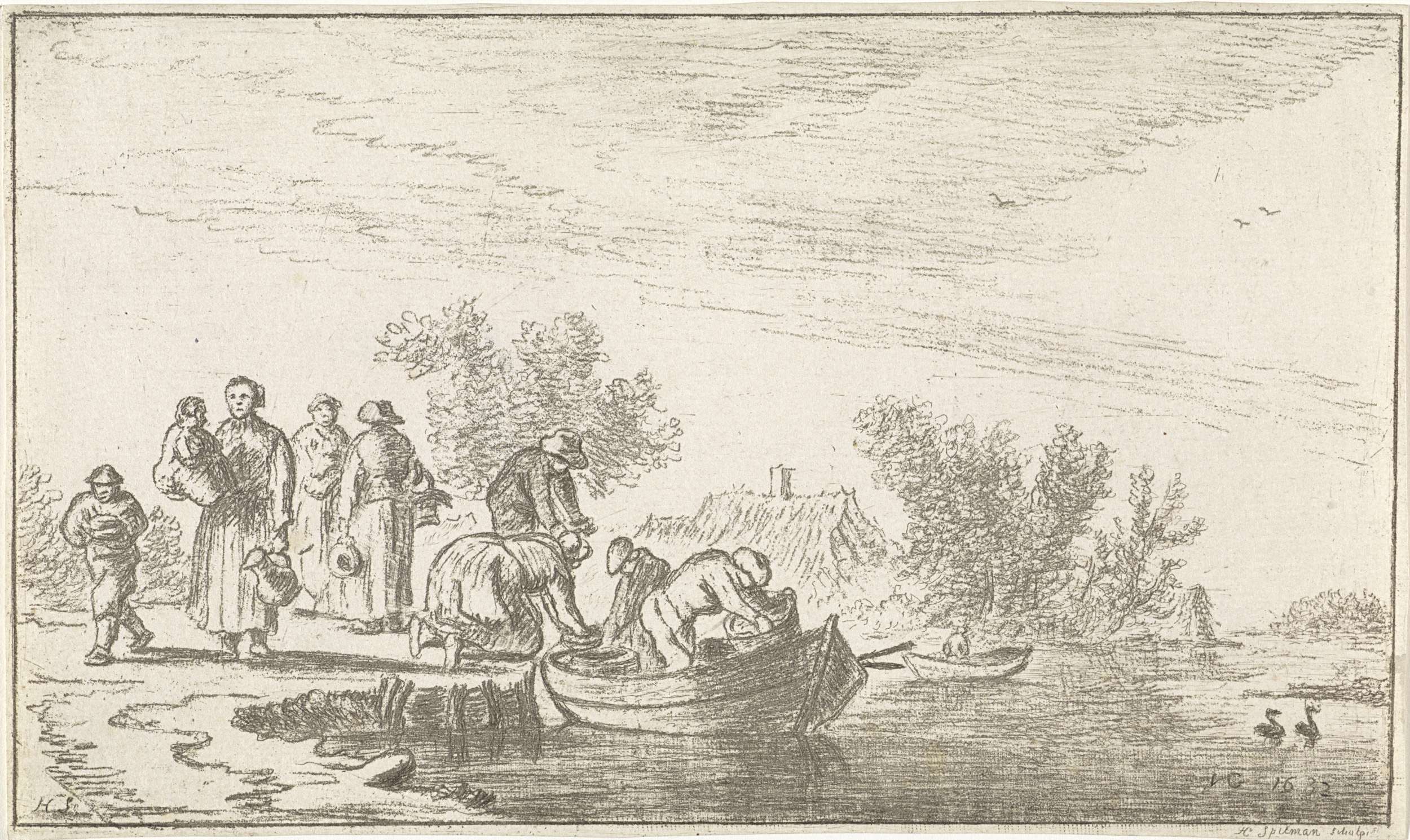 Riviergezicht met handelaren aan een oever bij huizen