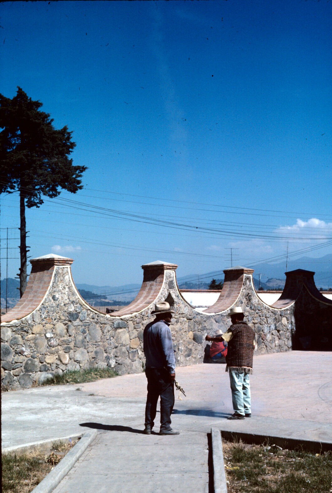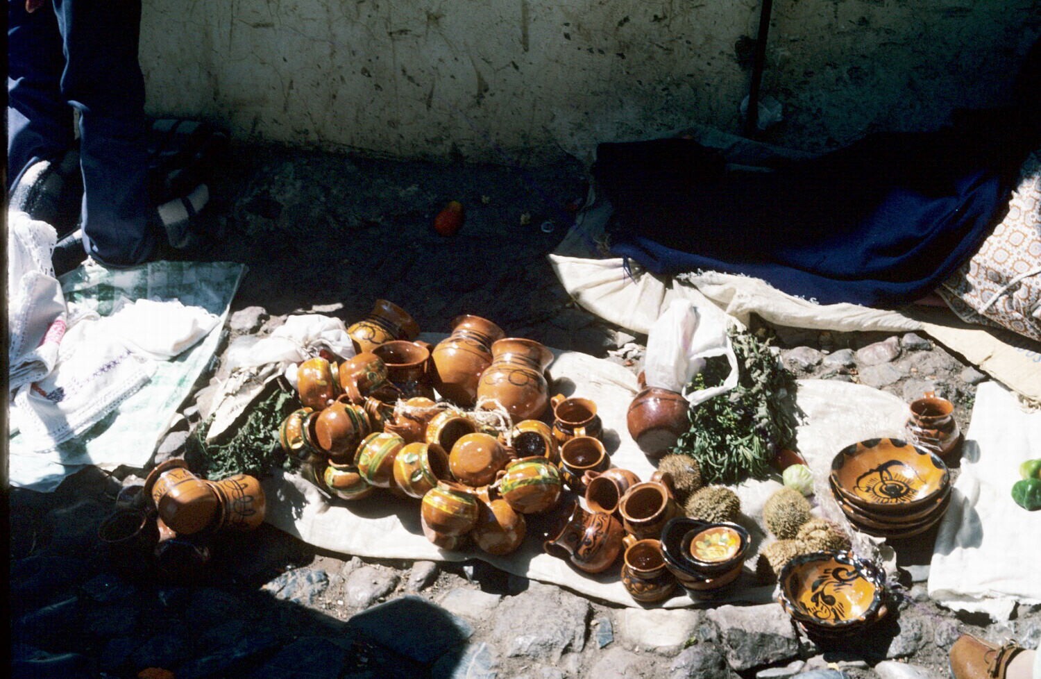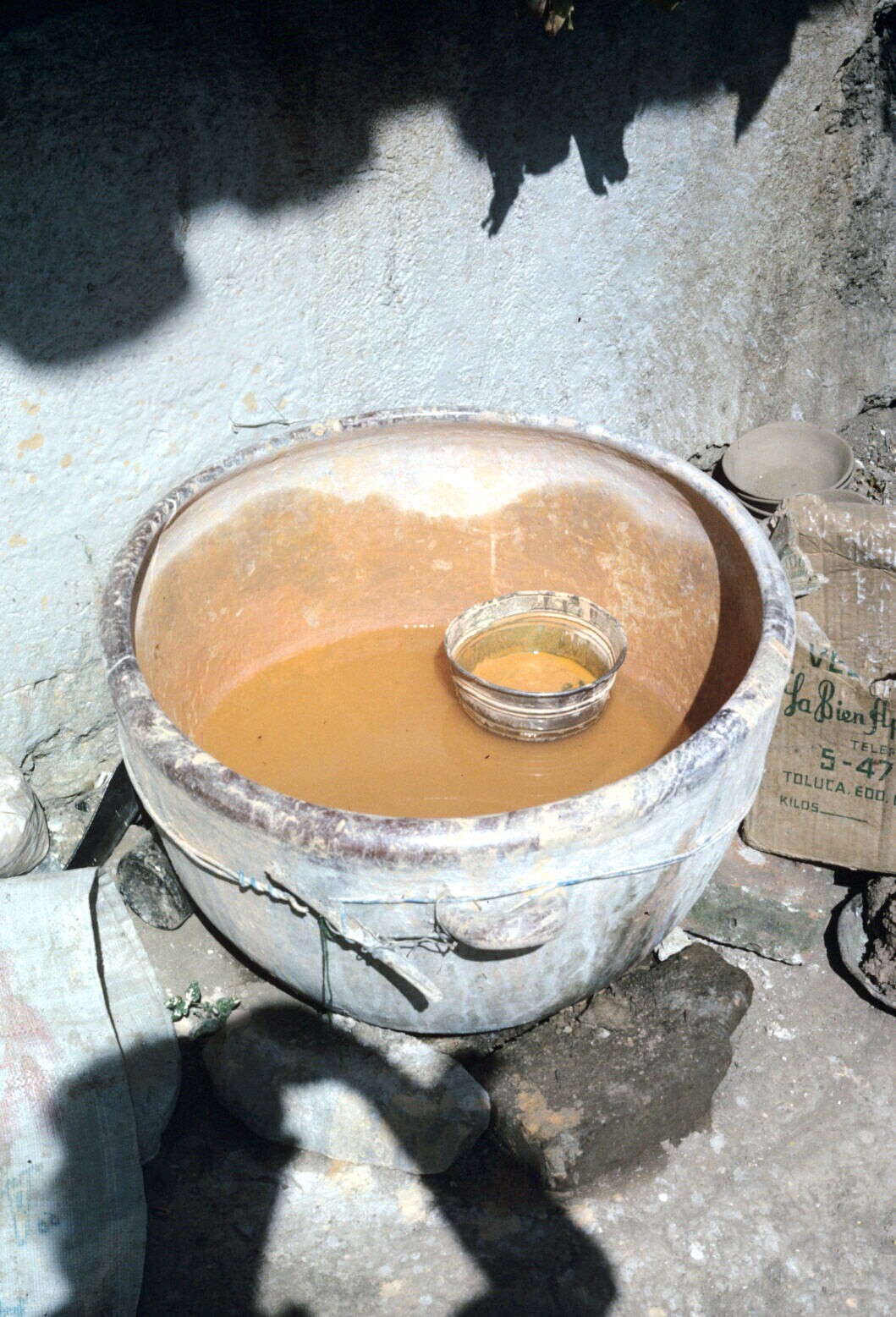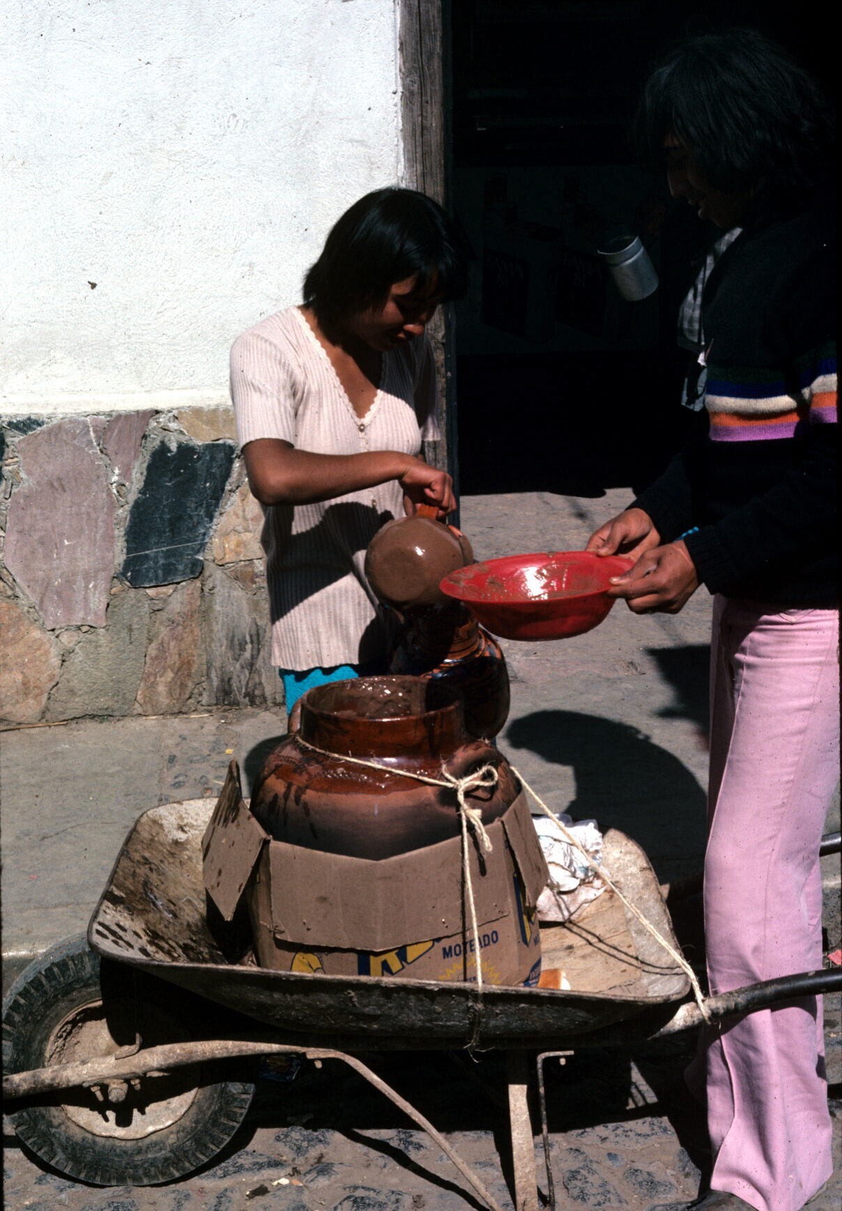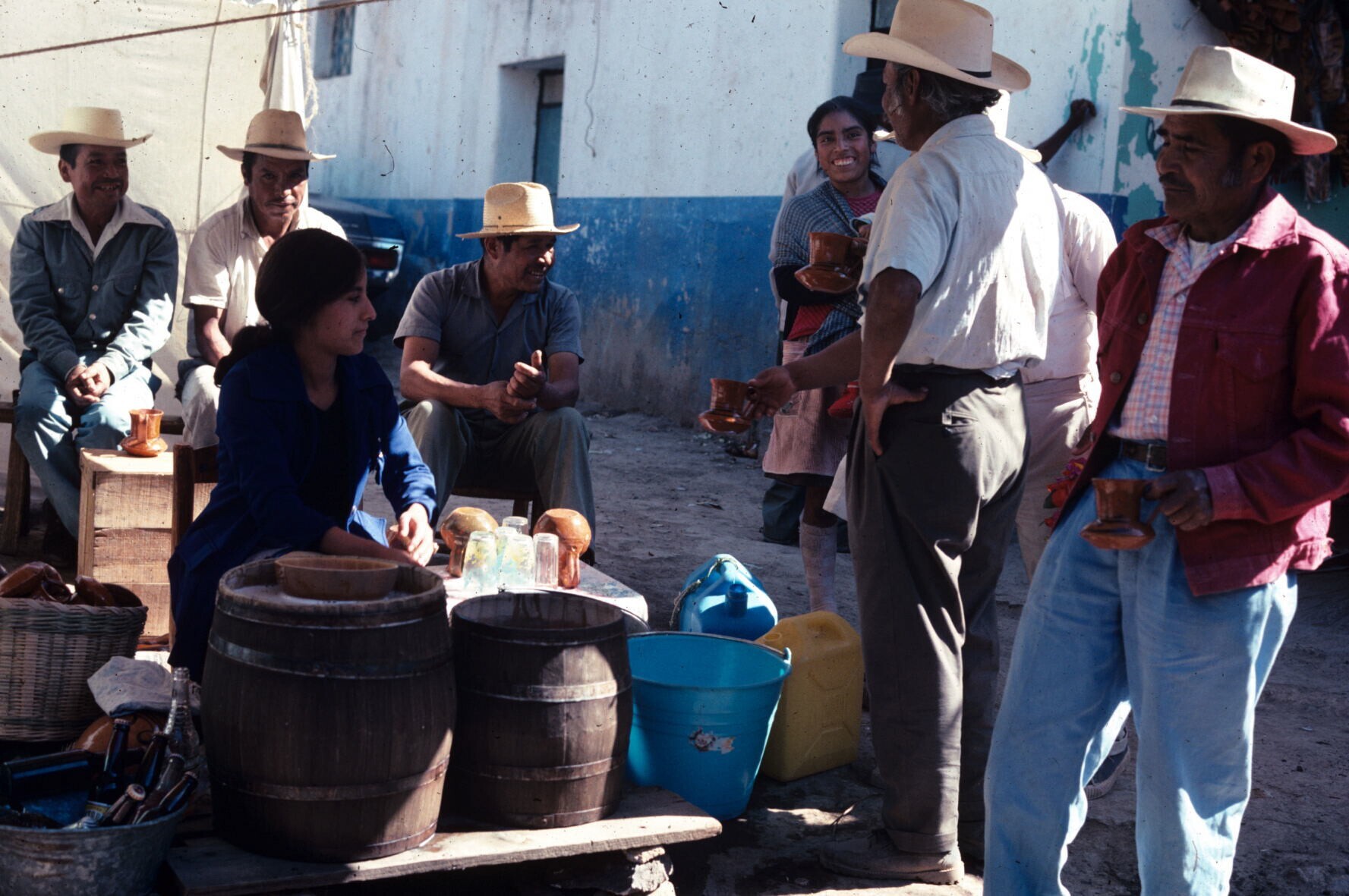 mannen bij pulquestalletje; NB pulquemokken uit Teco...