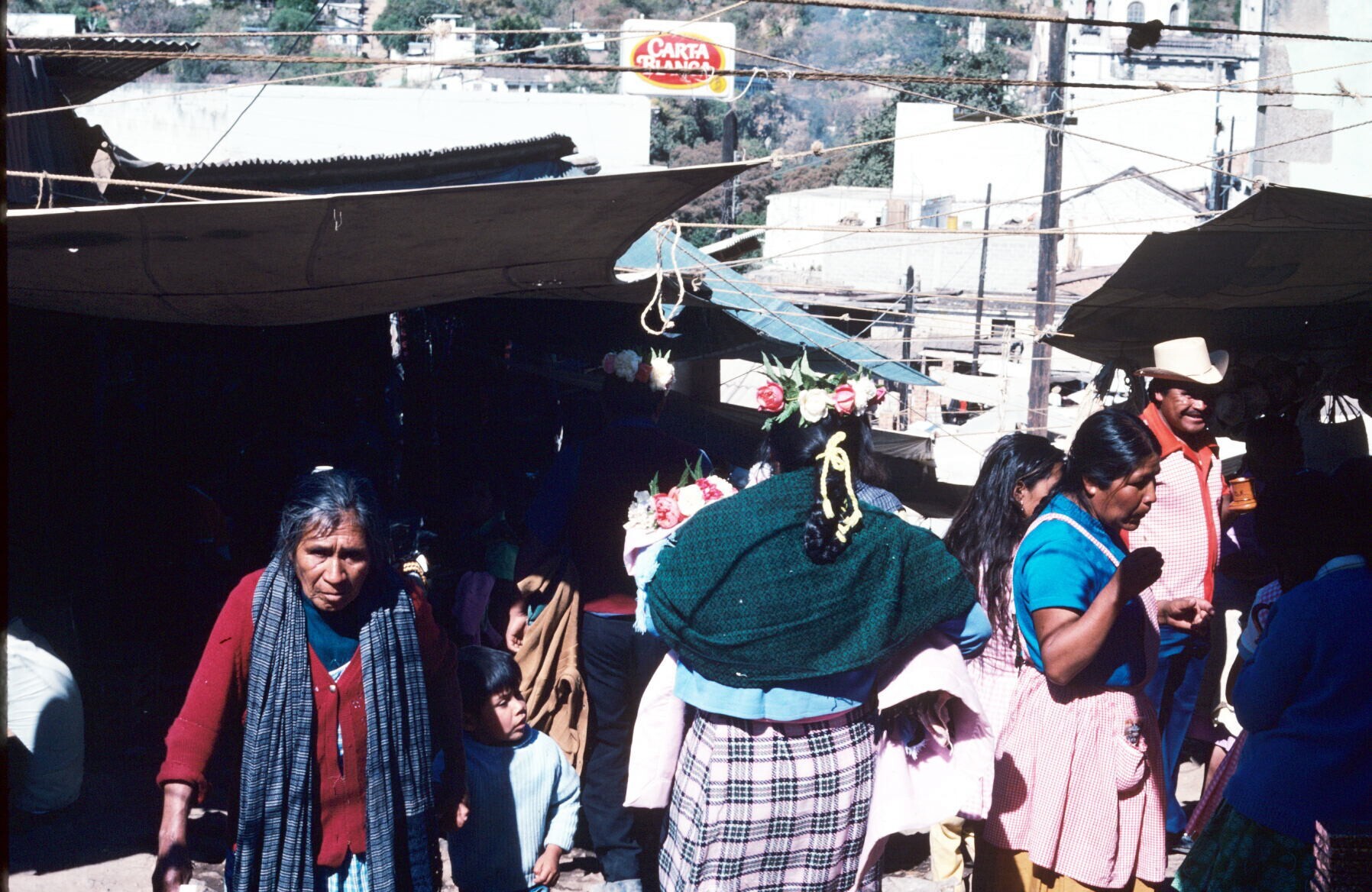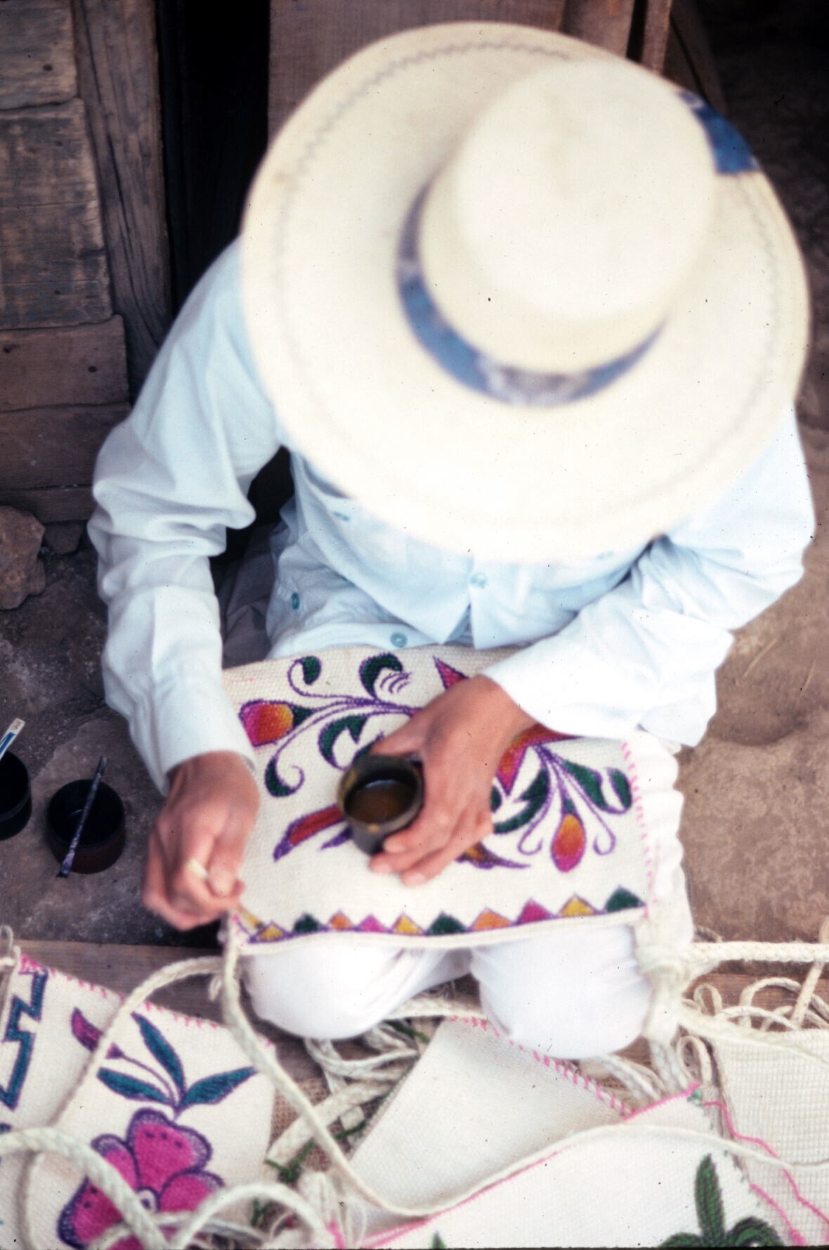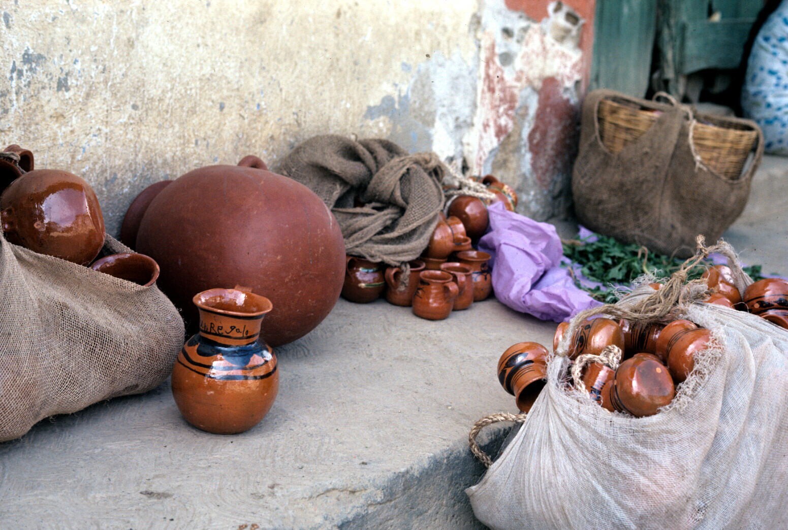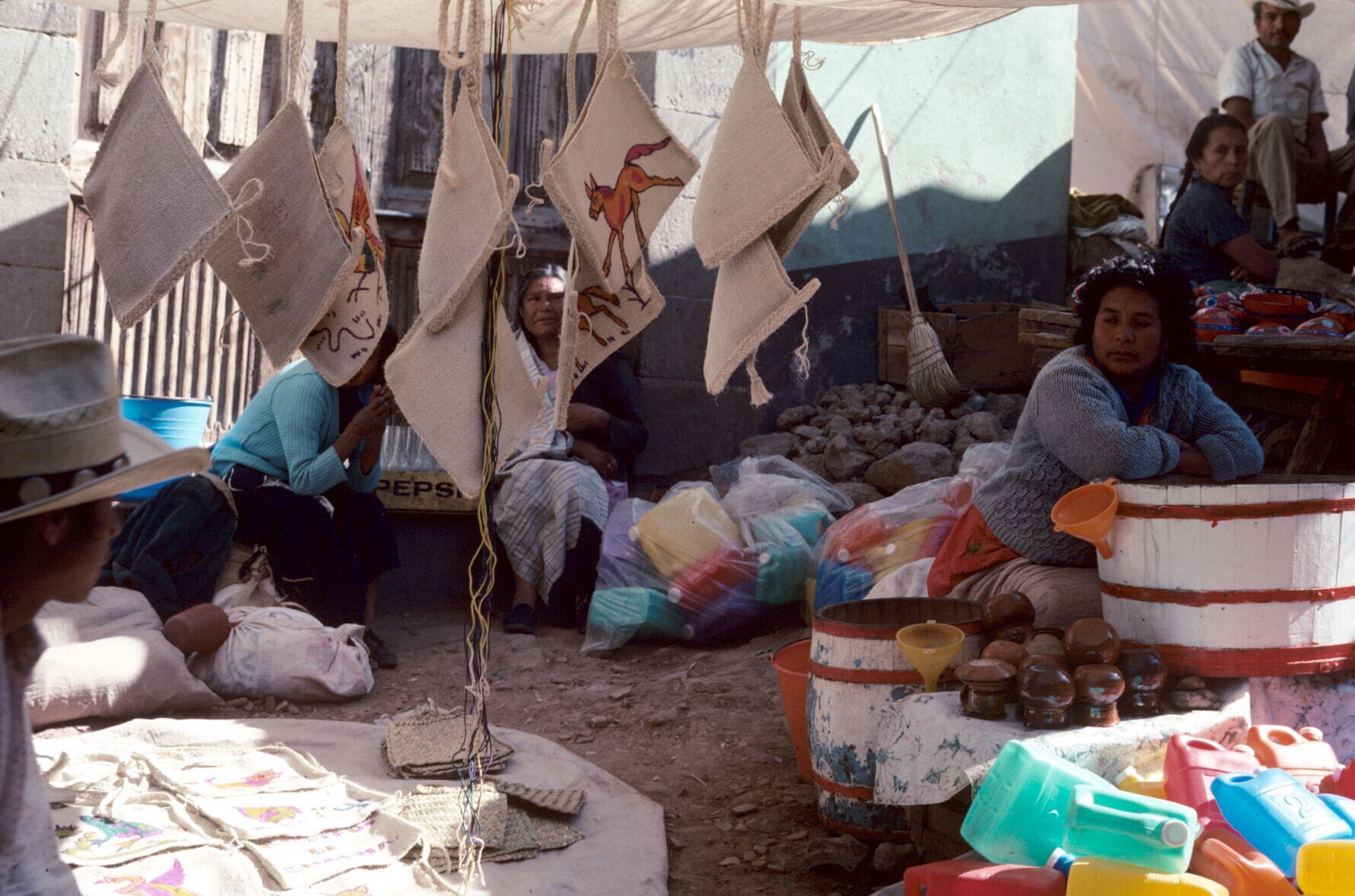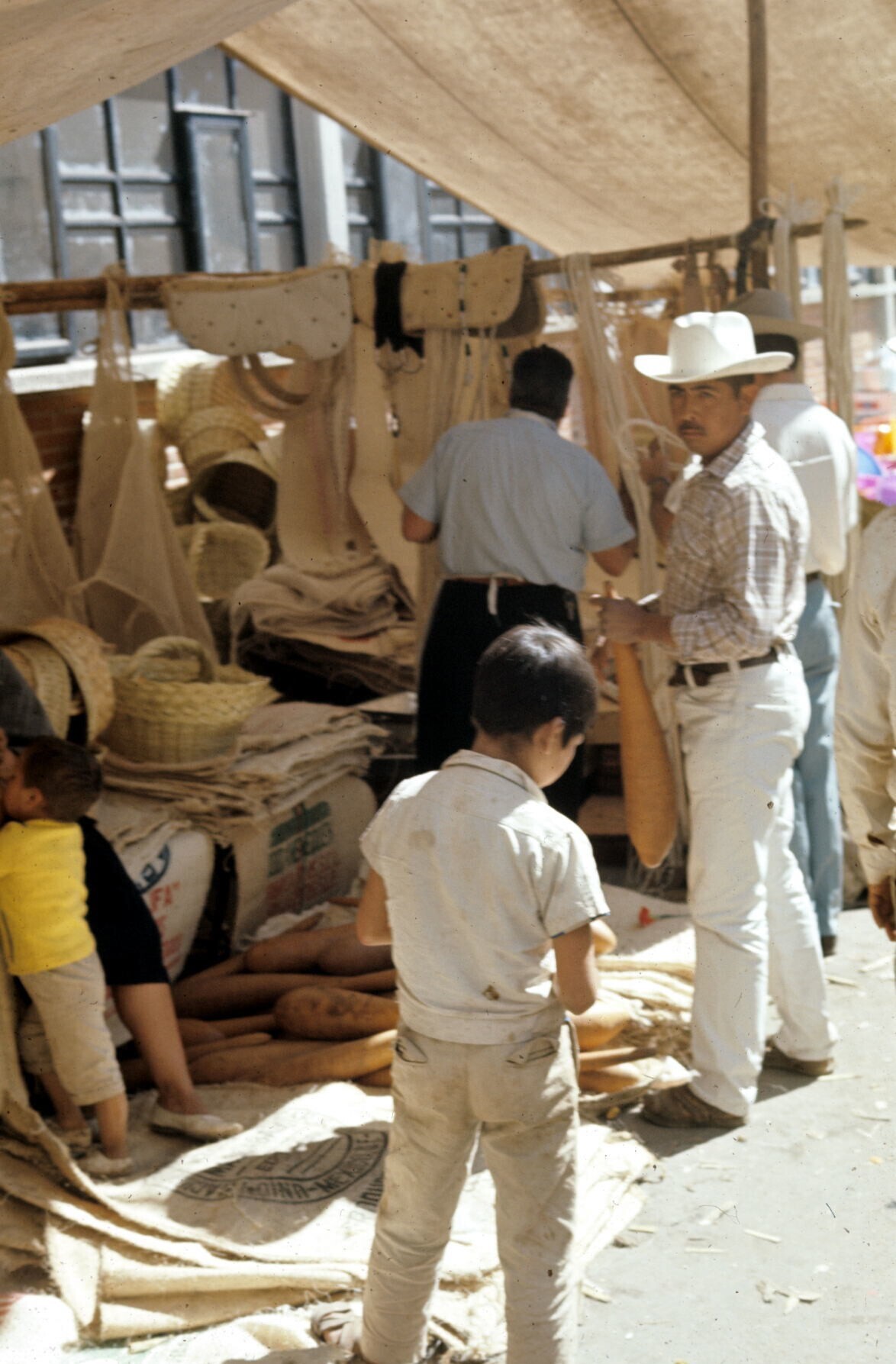 'ixtle'(agave)vezeltassen en pulqueverkoopster op markt