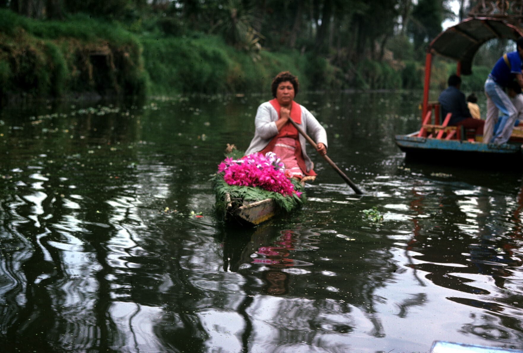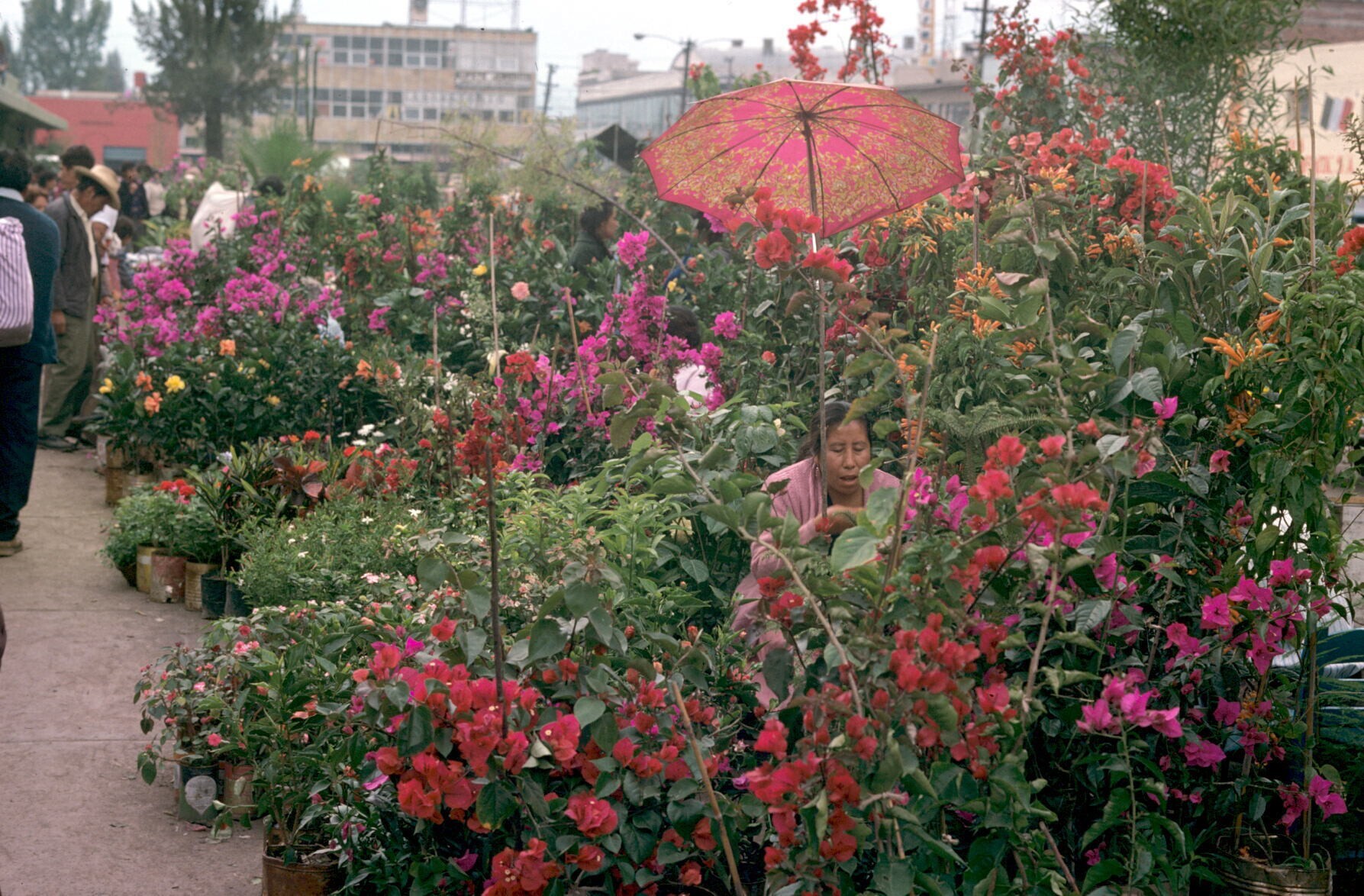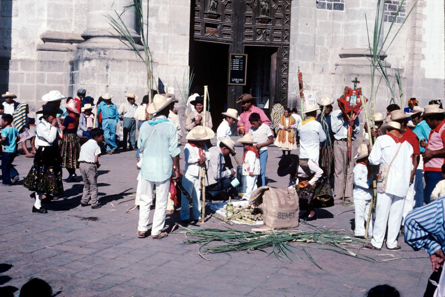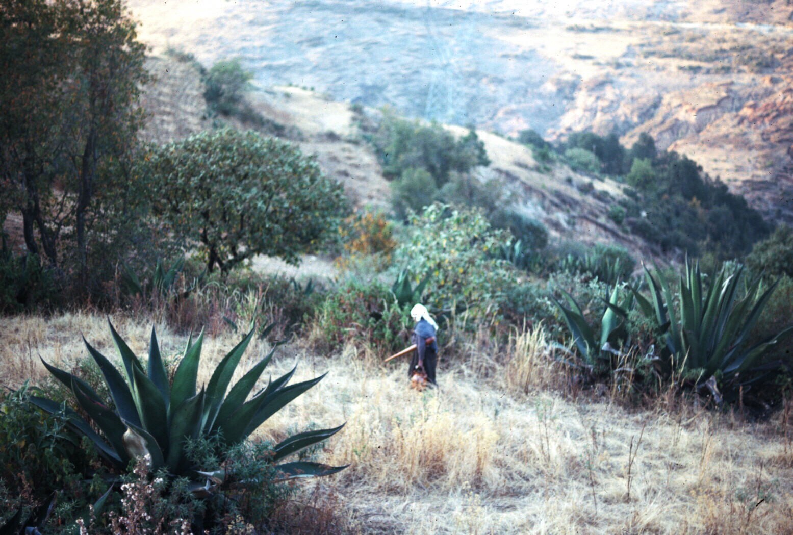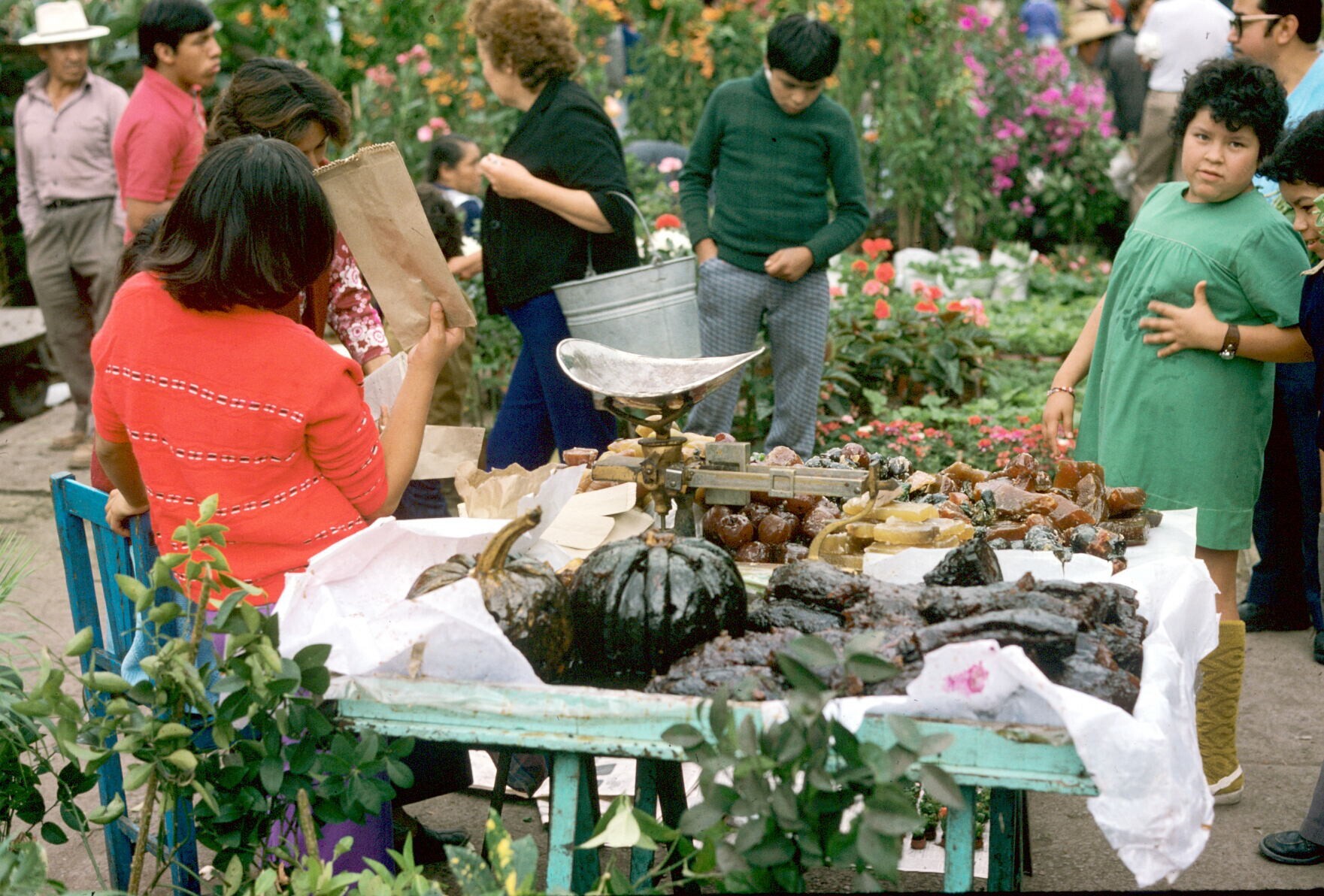 'ixtle'(agave)vezeltassen en pulqueverkoopster op markt