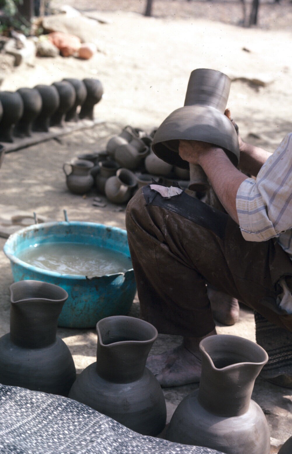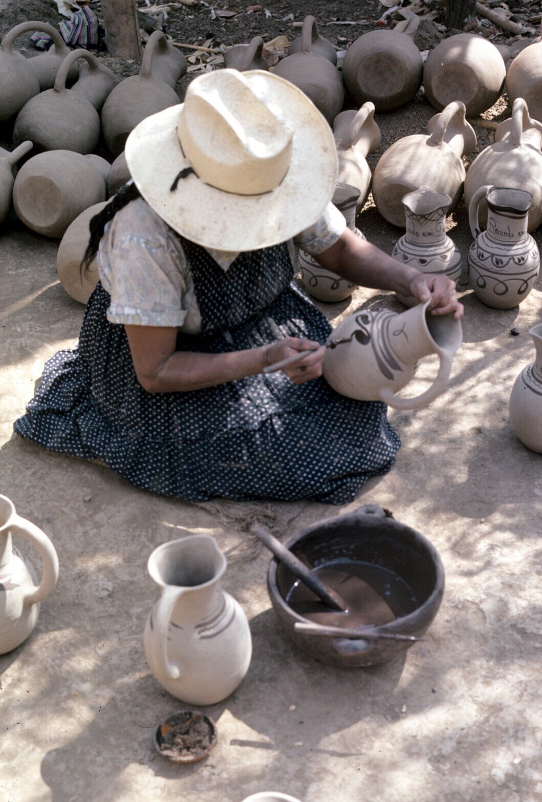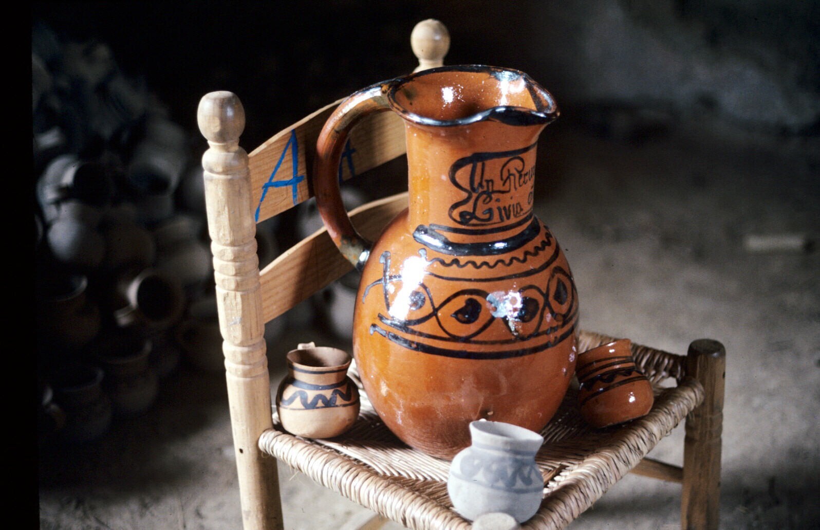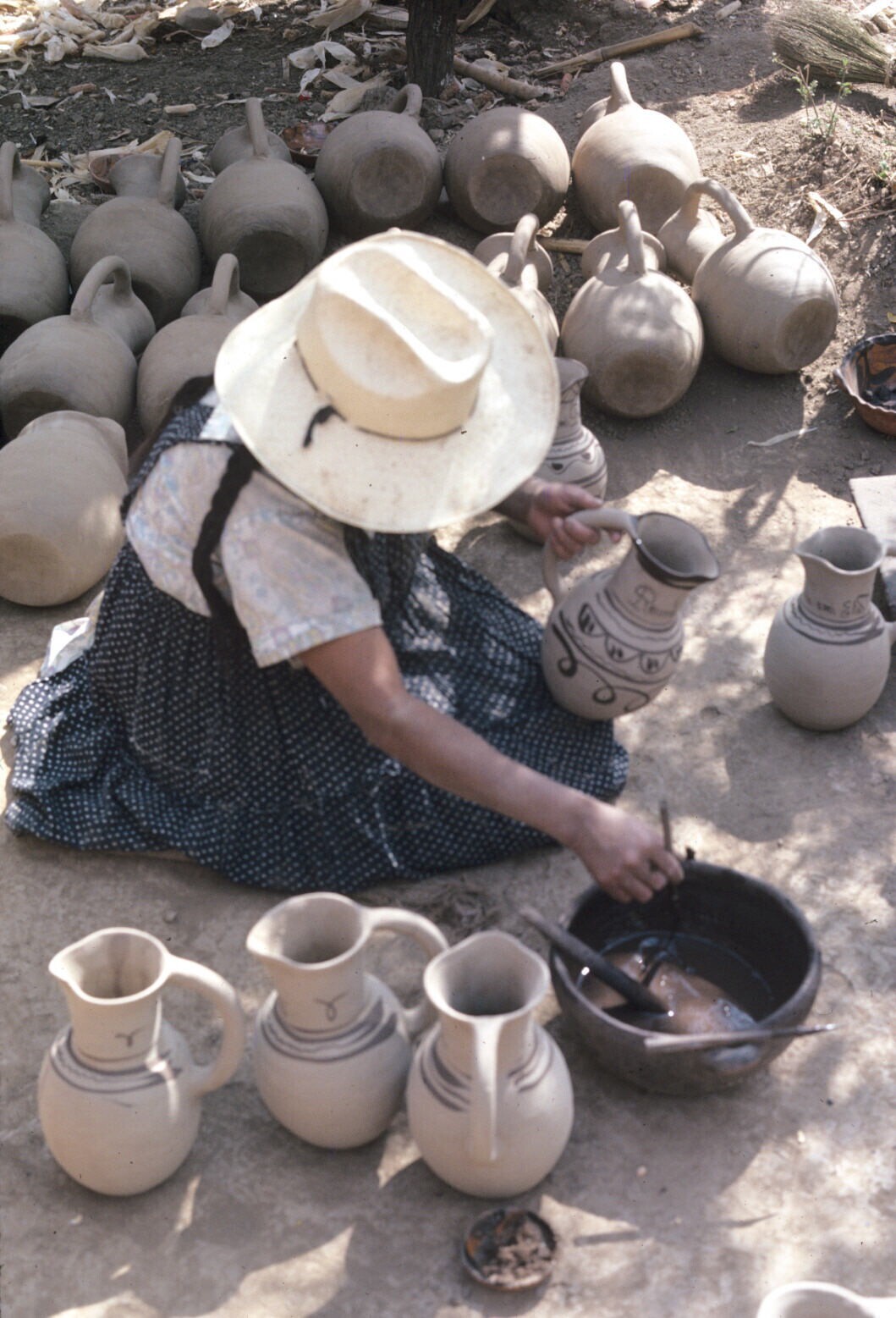 pottenbakkersvrouw met "jarra" (kruik) op erf