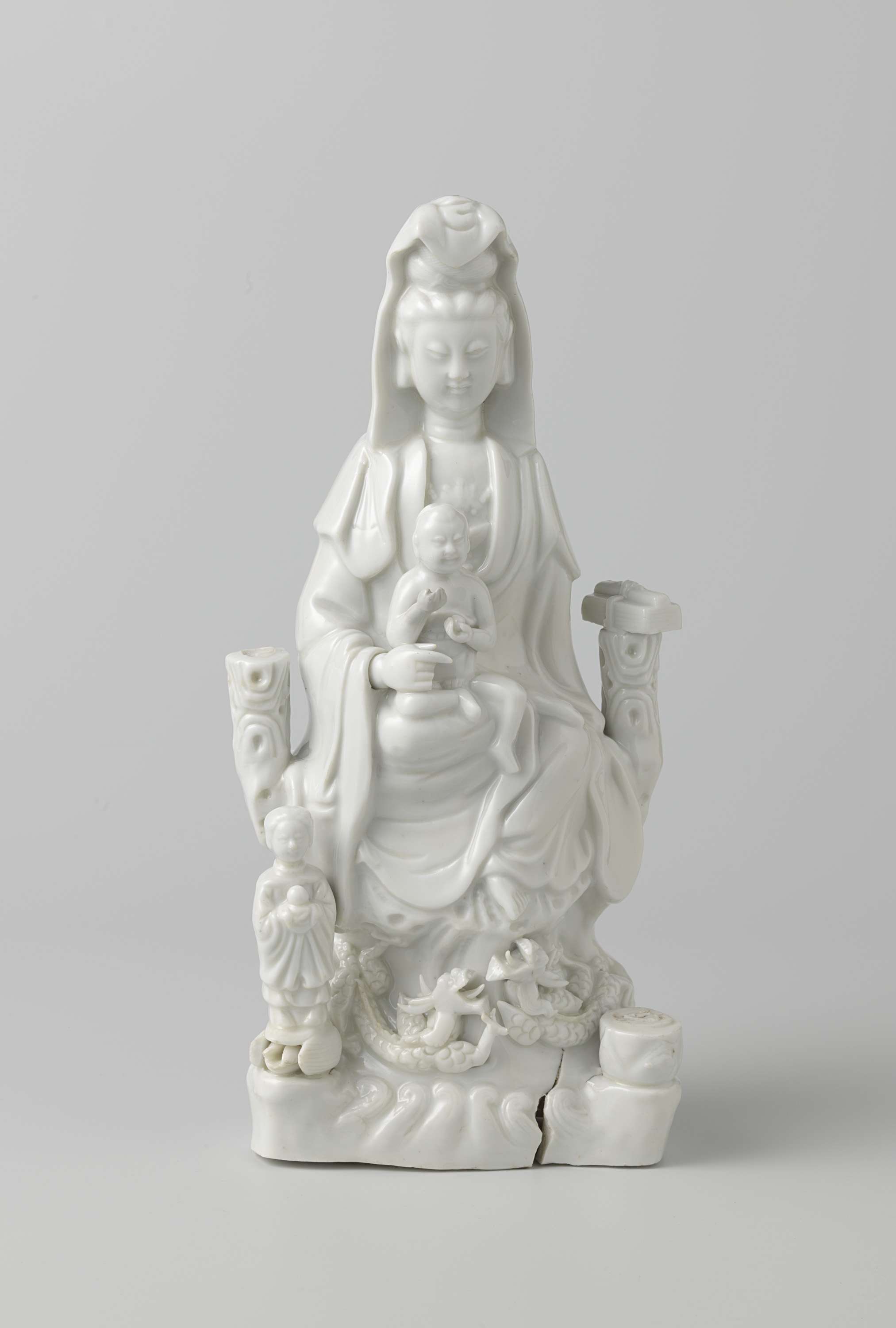 Zittende Guanyin met een kind, begeleid door de Drak...