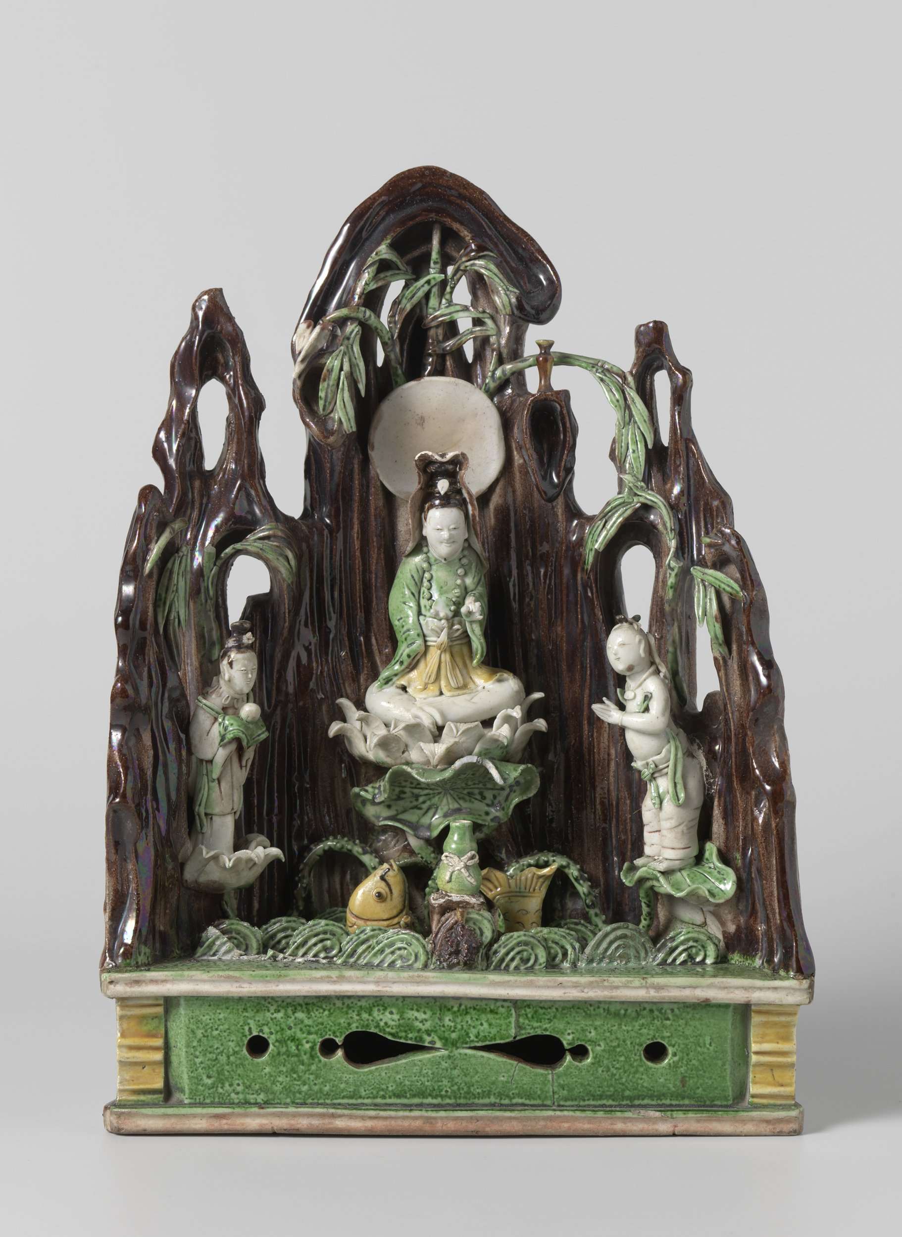 Guanyin zittend op een lotustroon met twee bedienden