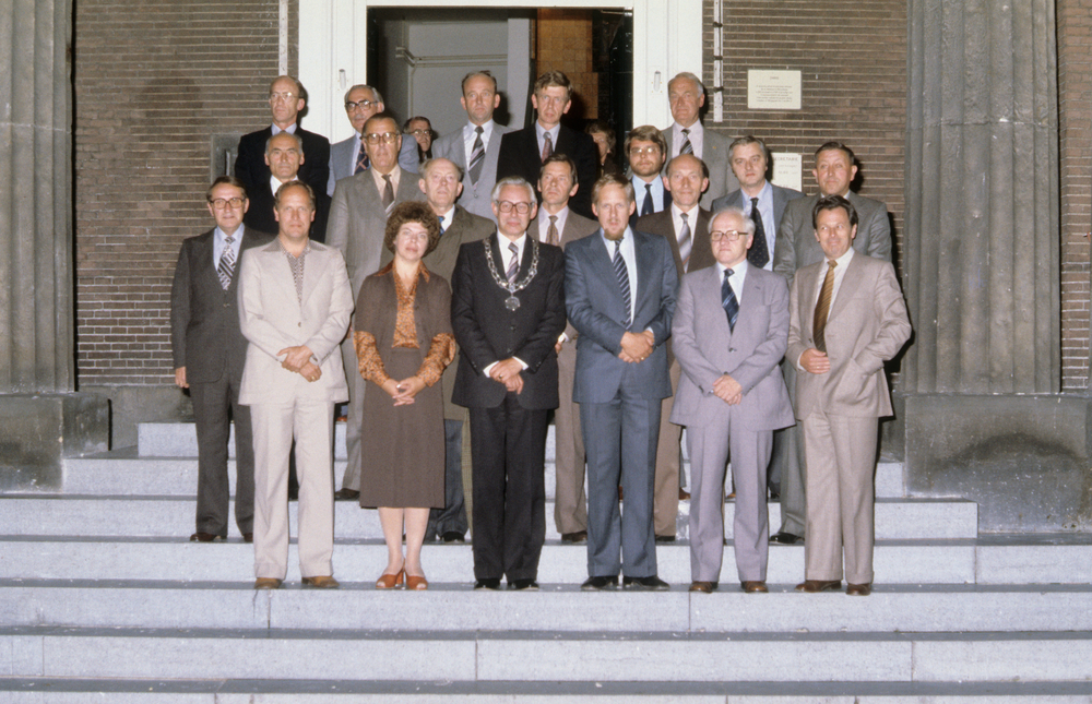 Gemeentebestuur met maquette van het nieuwe gemeente...