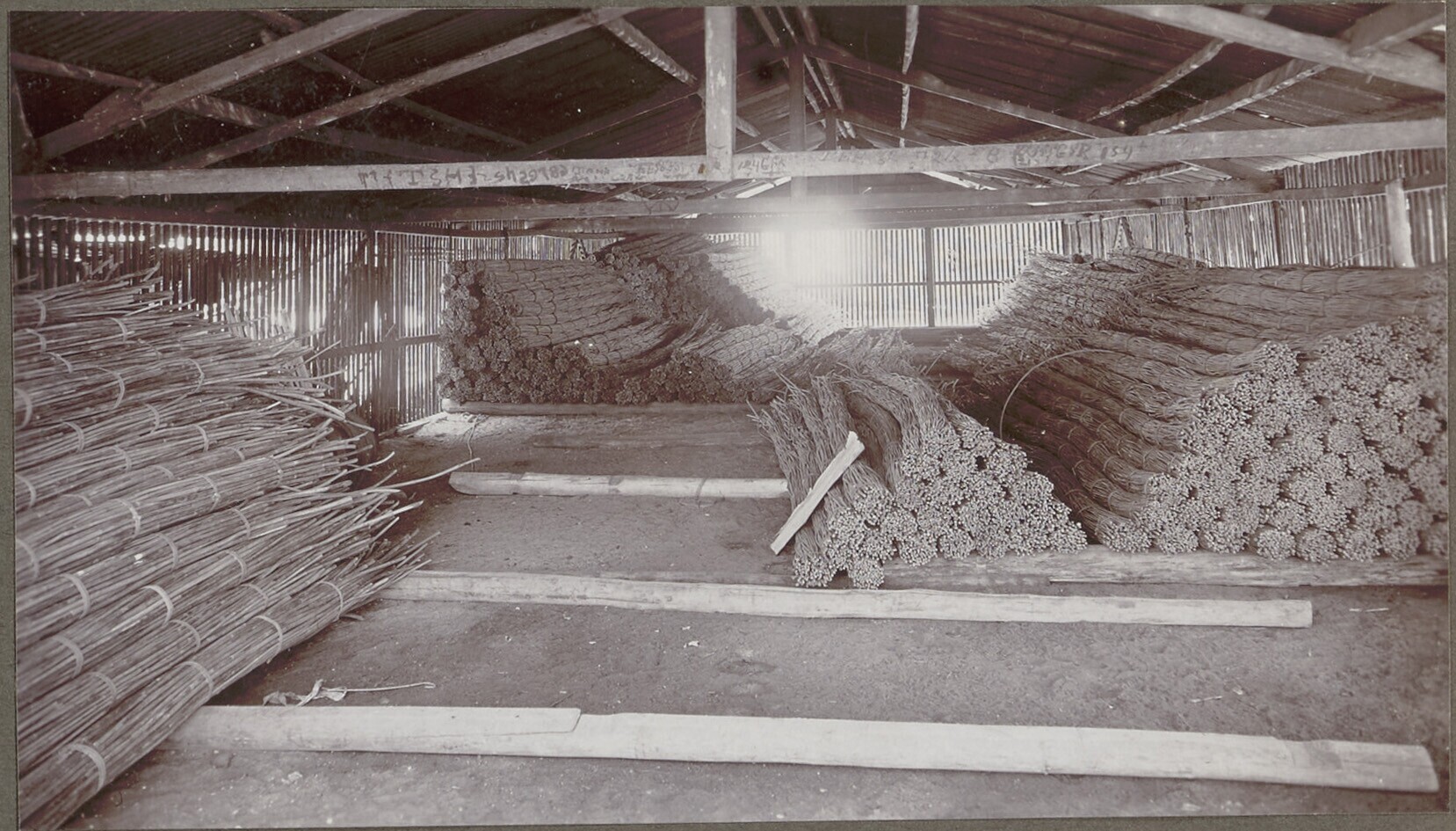 Opgestapeld rotan in opslagloods in afwachting van d...