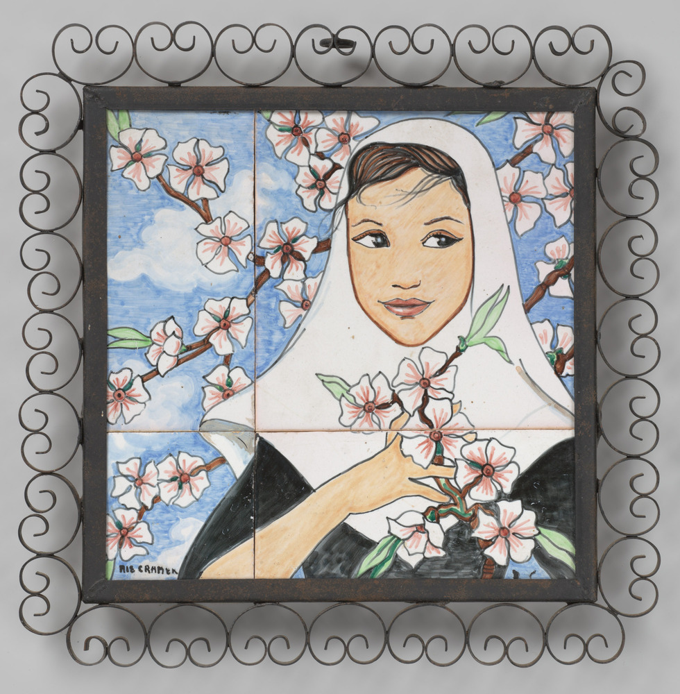 tegeltableau, voorstellende: meisje met bloemen, ver...